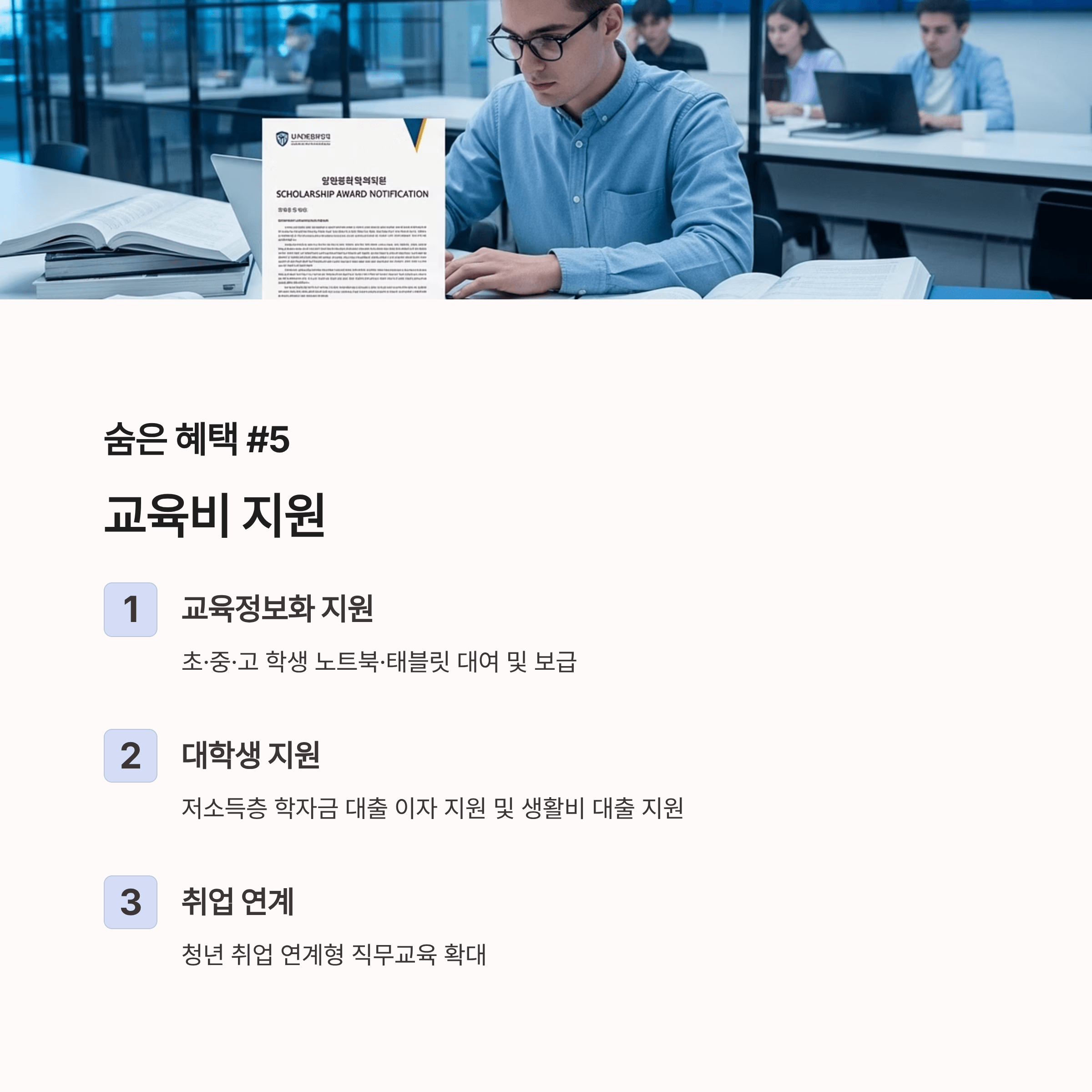 저소득층 대학생은 학자금 대출 이자 지원을 받을 수 있으며, 청년 대상 취업 연계형 직무교육도 강화되었습니다.