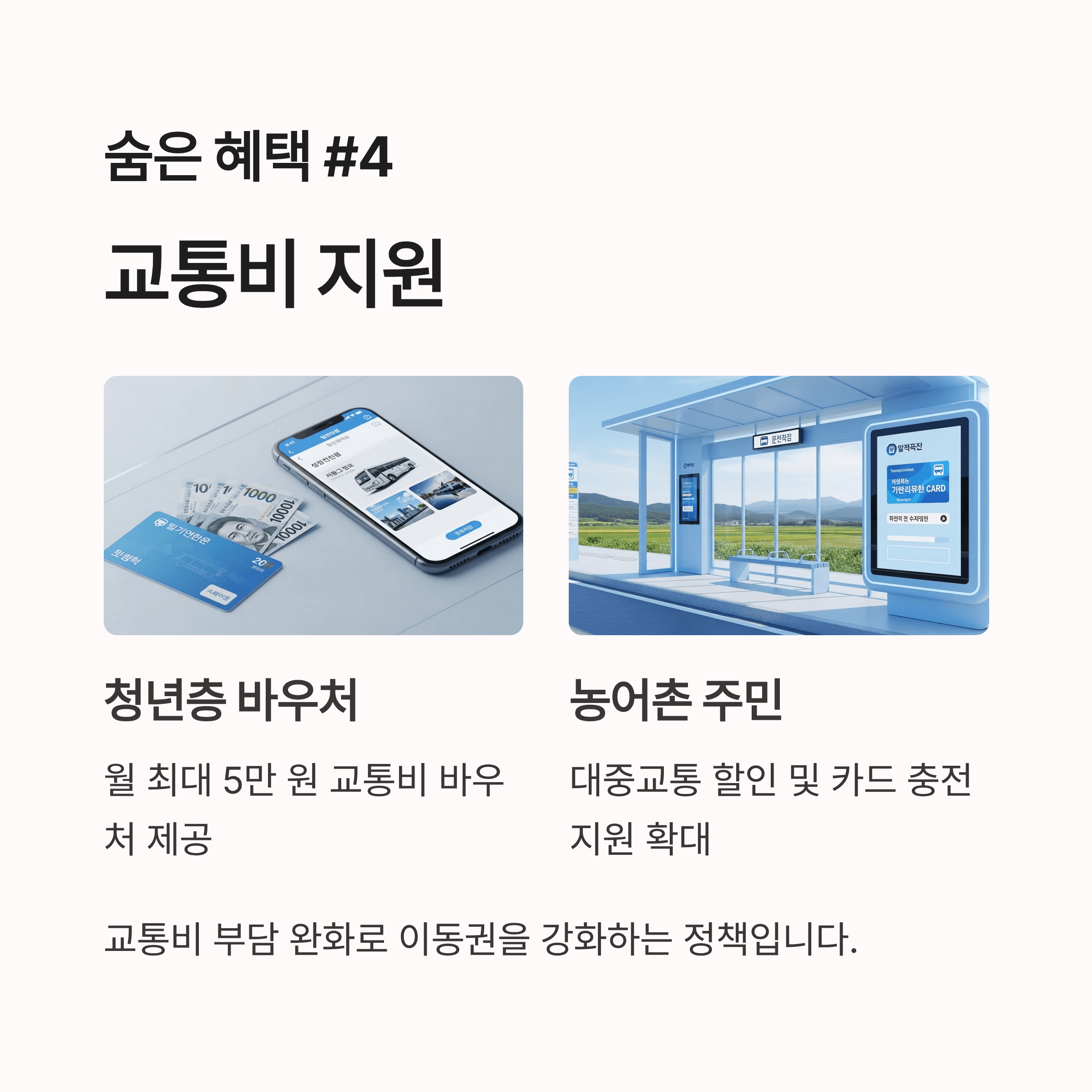 청년층에는 월 최대 5만 원 상당의 교통비 바우처가 제공되며, 농어촌 주민은 대중교통 할인 및 카드 충전 지원이 확대됩니다.