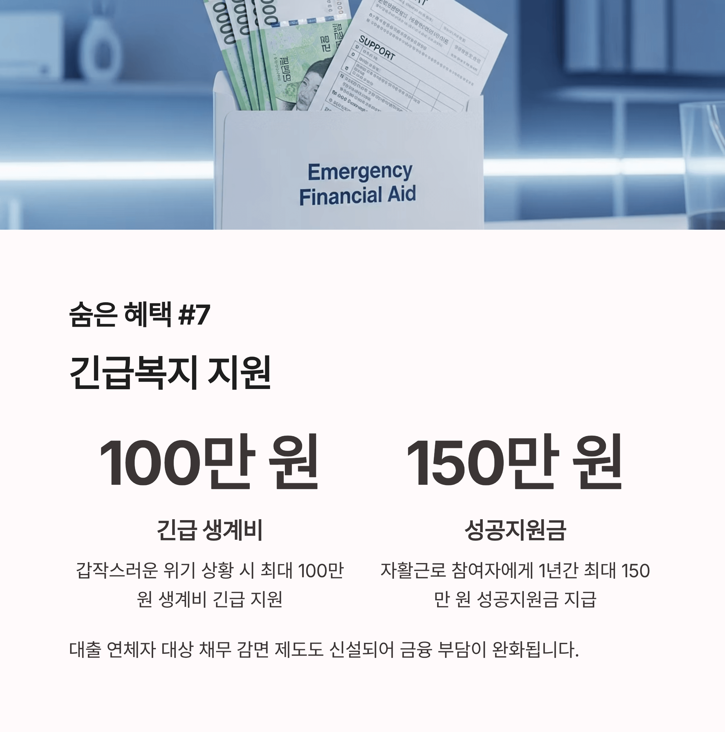 자활근로 참여자에게는 1년간 최대 150만 원의 성공지원금이 지급되며, 대출 연체자 대상 채무 감면 제도도 신설되었습니다.