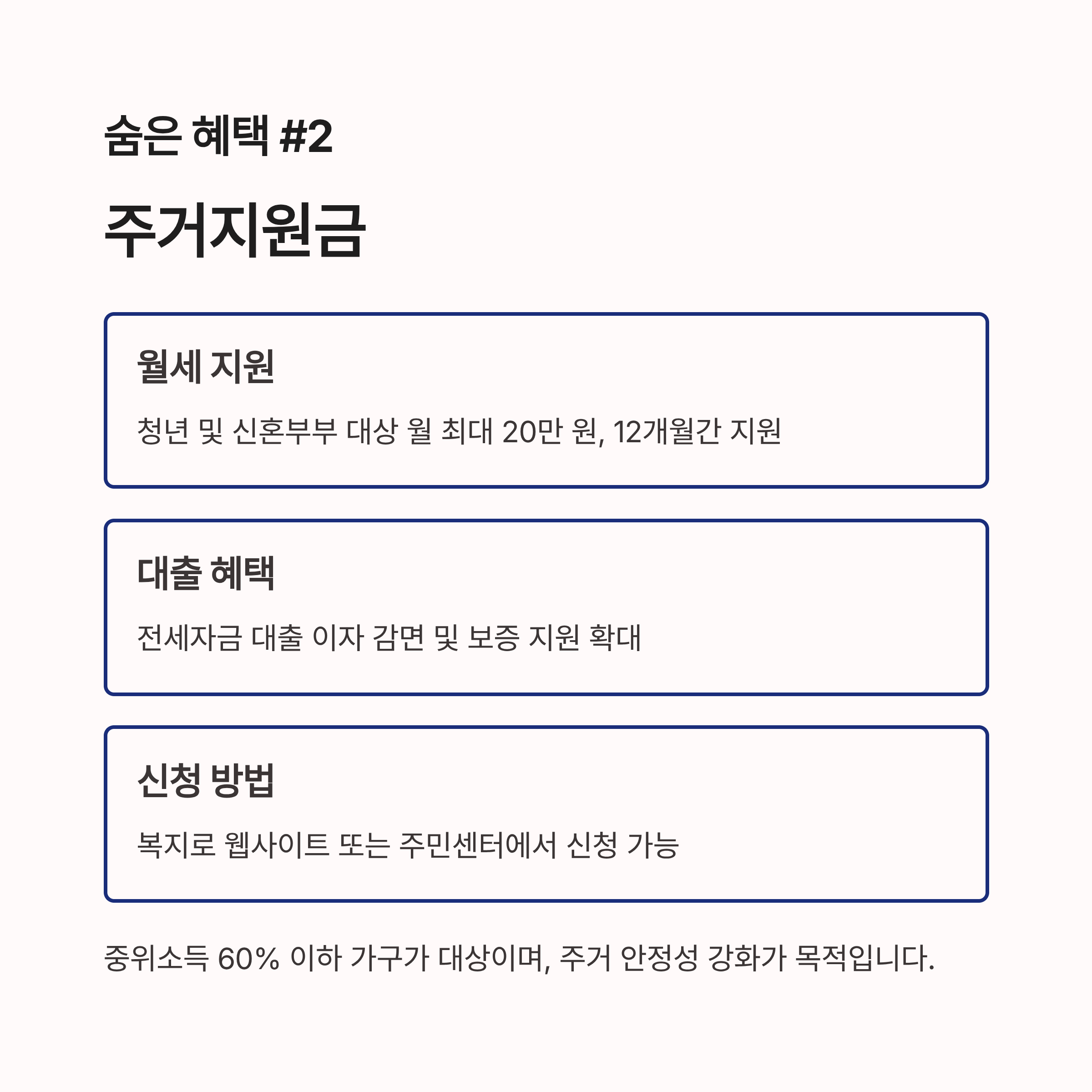 청년, 신혼부부, 저소득층을 대상으로 월 최대 20만 원씩 12개월간 월세를 지원합니다.