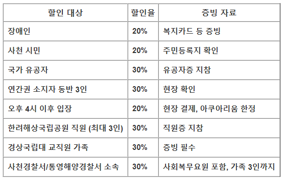 지역 주민, 국가 유공자, 장애인 등을 위한 할인 혜택이 있으며, 오후 시간대나 연간권 소지자 동반 할인도 제공됩니다.