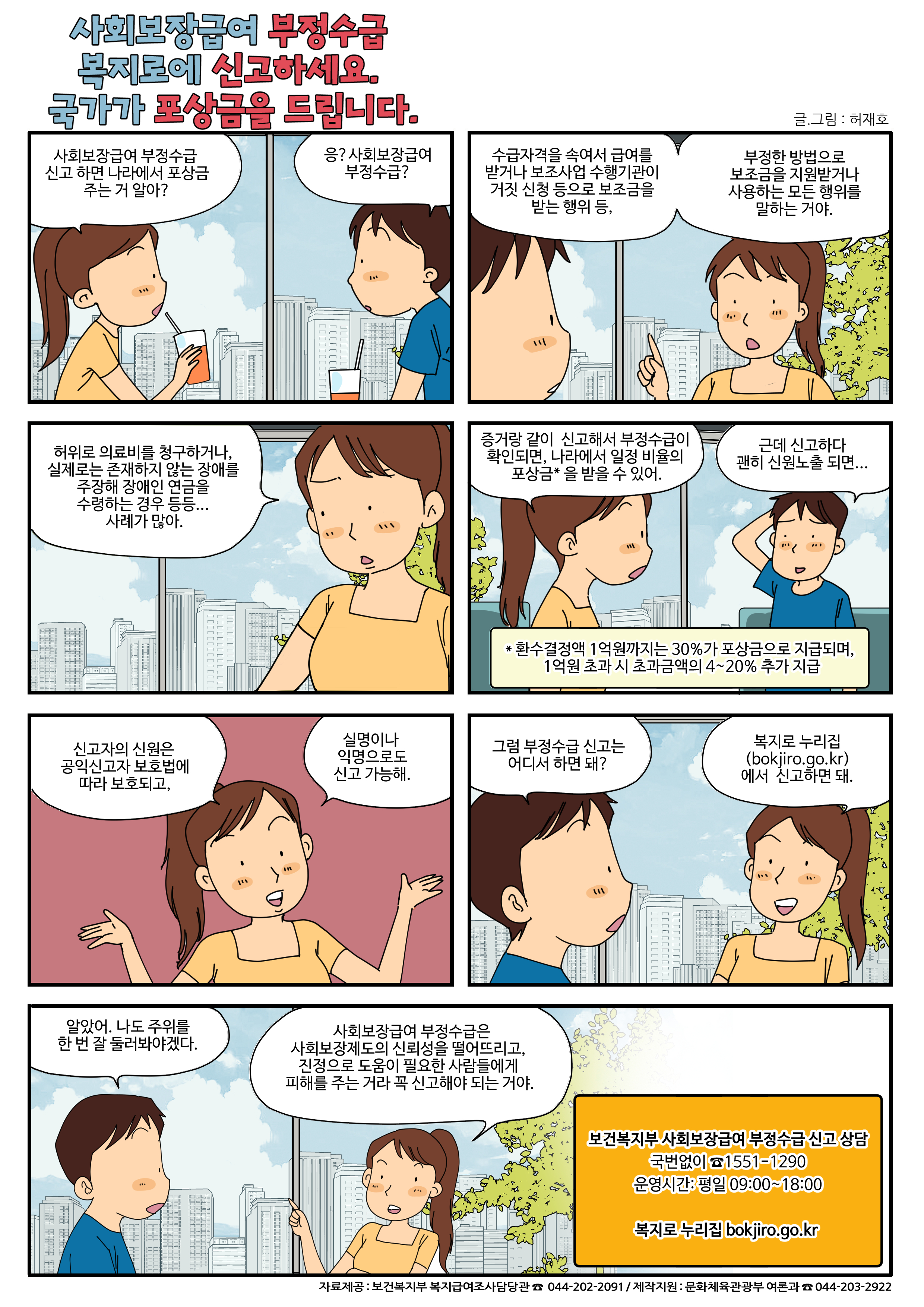 또, 보건복지부 사회보장급여 부정수급 신고·상담 전화(☎1551-1290, 평일 09:00~18:00)를 이용하실 수도 있습니다.