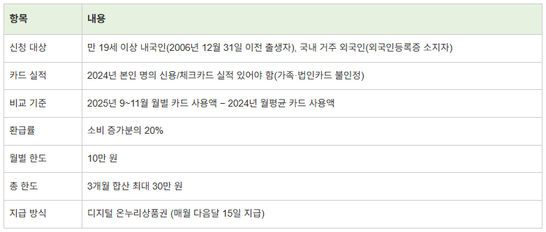 상생페이백은 2025년 9월~11월 동안 카드 사용액이 2024년 월평균보다 증가한 국민·외국인에게 소비 증가분의 20%를 디지털 온누리상품권으로 환급해주는 정부 지원제도입니다.