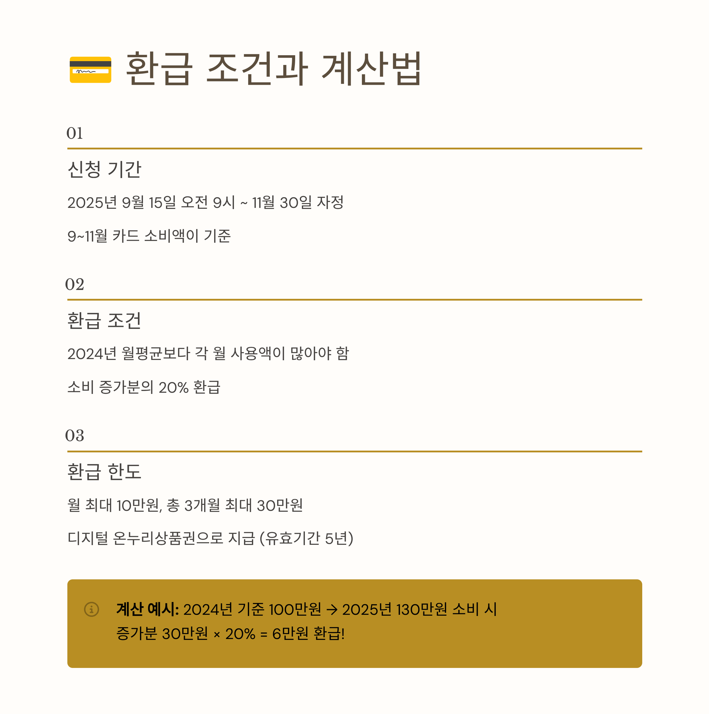 - 예시①: 2024년 월평균 50만 원 · 2025년 9월 80만 원 → 증가분 30만 원 × 20% = 6만 원 환급