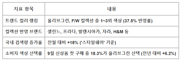 - 미샤(Michaa): 30종 이상의 올리브그린 제품 출시, 2주간 전체 컬러 매출의 28% 차지