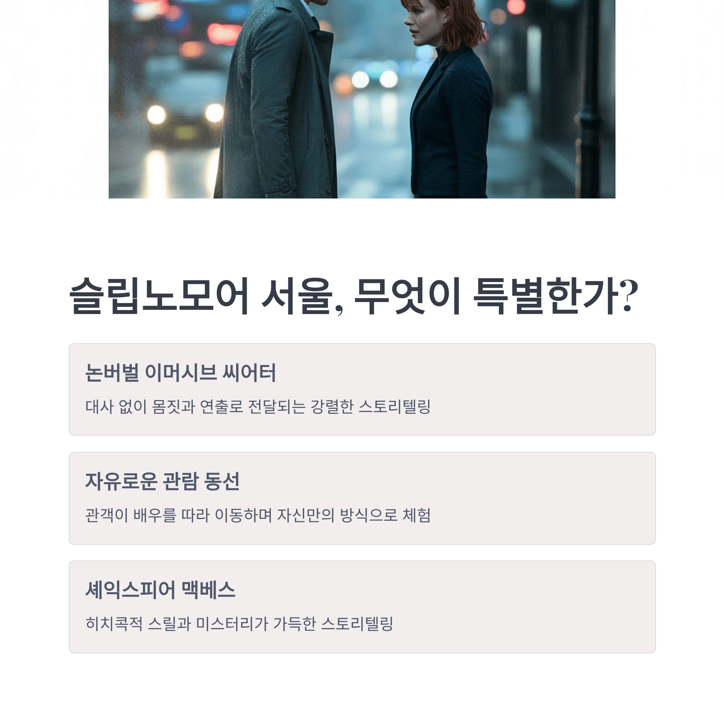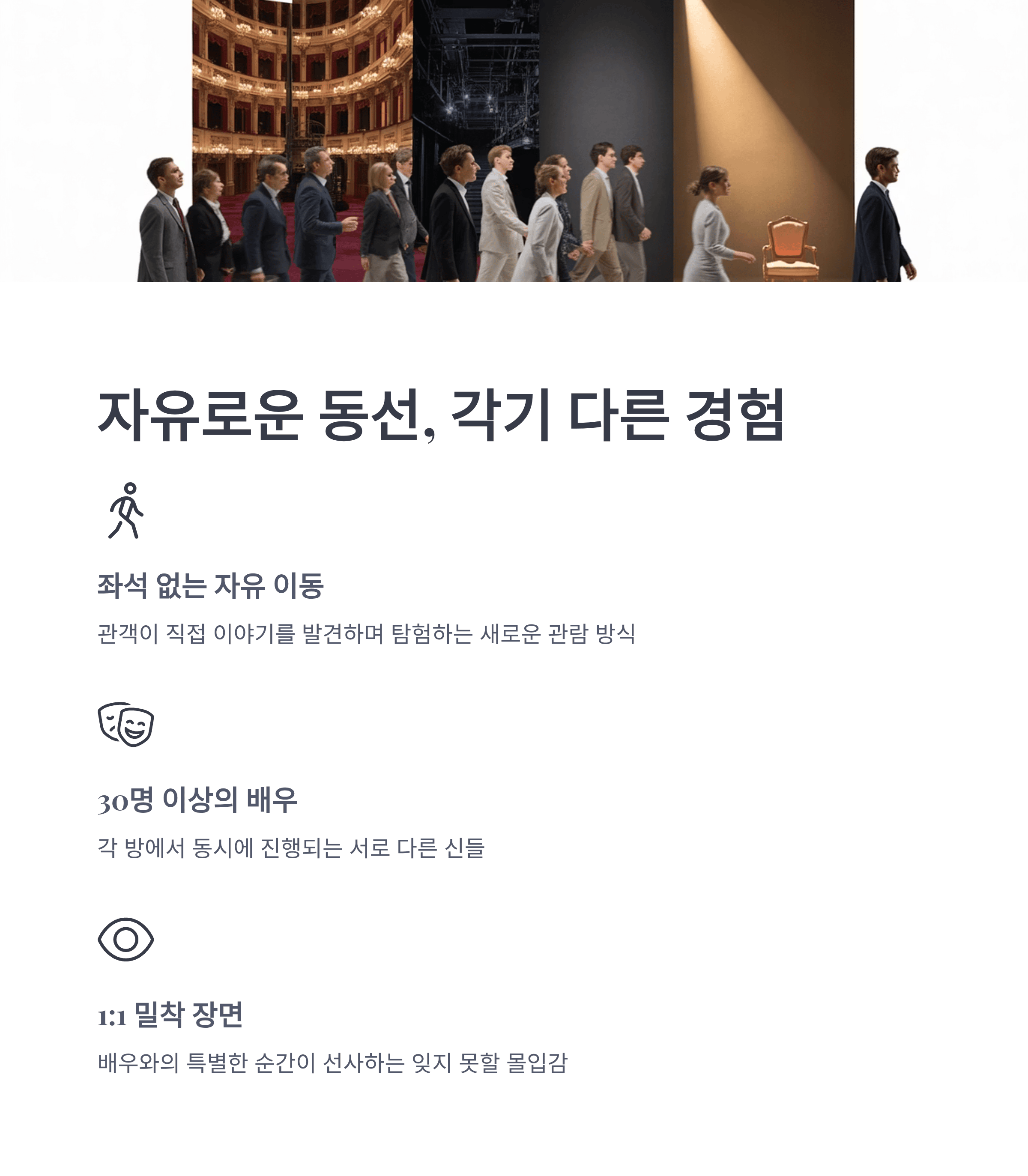 관객은 좌석 없이 자유롭게 이동하며 이야기를 '직접 발견'하게 됩니다.