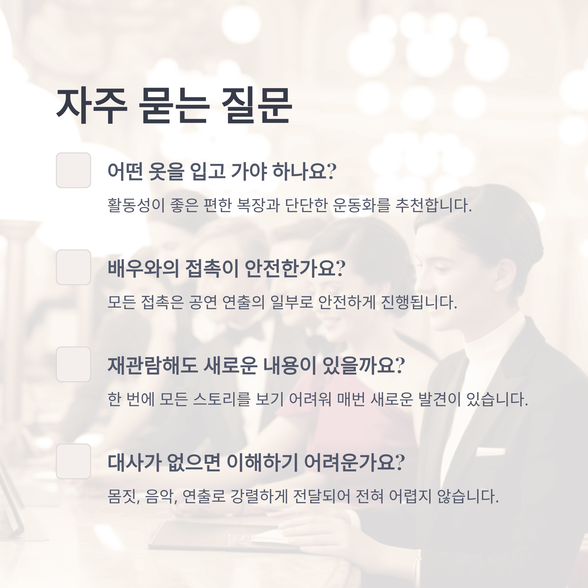 배우와의 1:1 밀착 장면이나 비밀 공간에서 벌어지는 특별한 순간은 관객에게 잊지 못할 몰입감을 선사합니다.