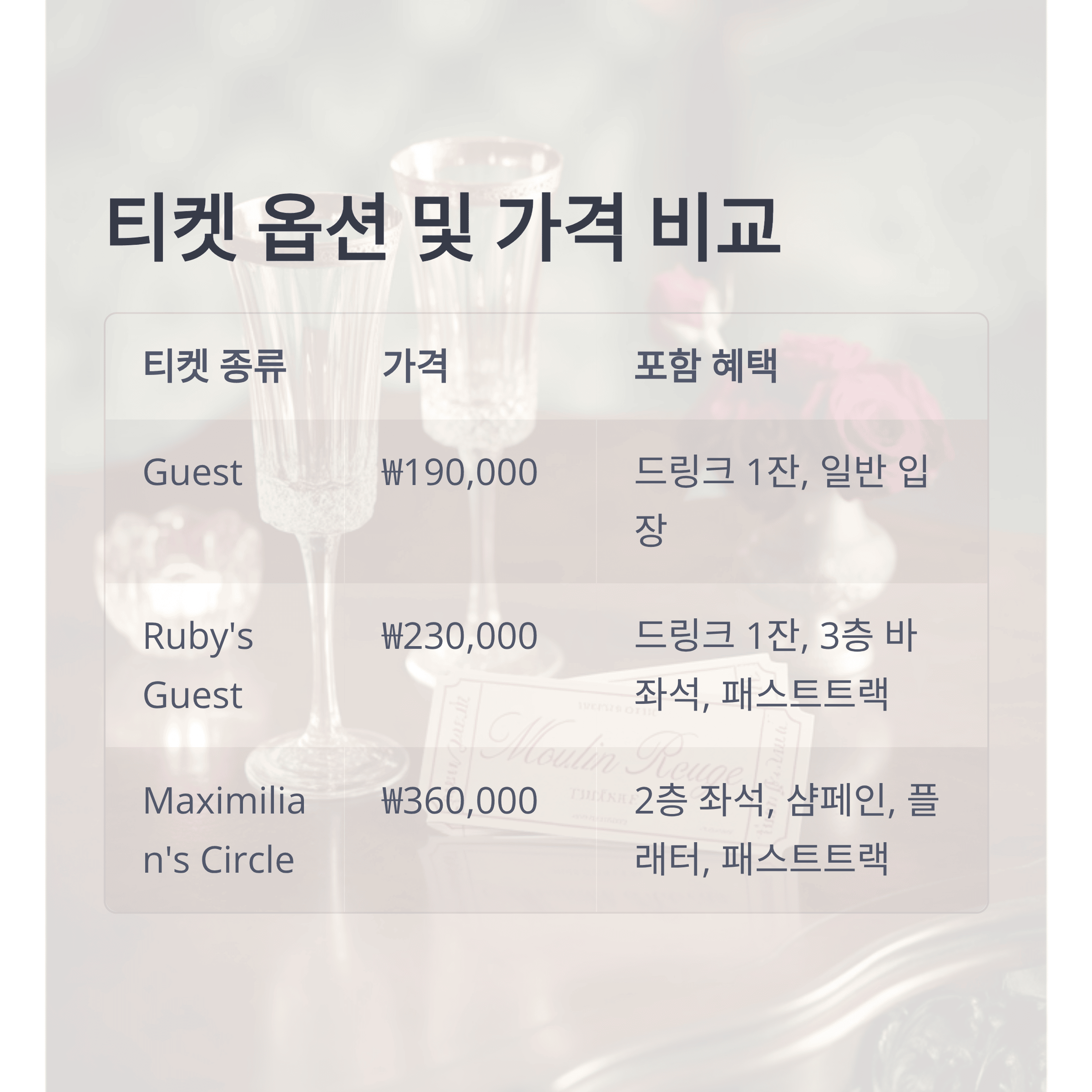 | Guest | ₩190,000 | 드링크 1잔 포함, 일반 입장 |