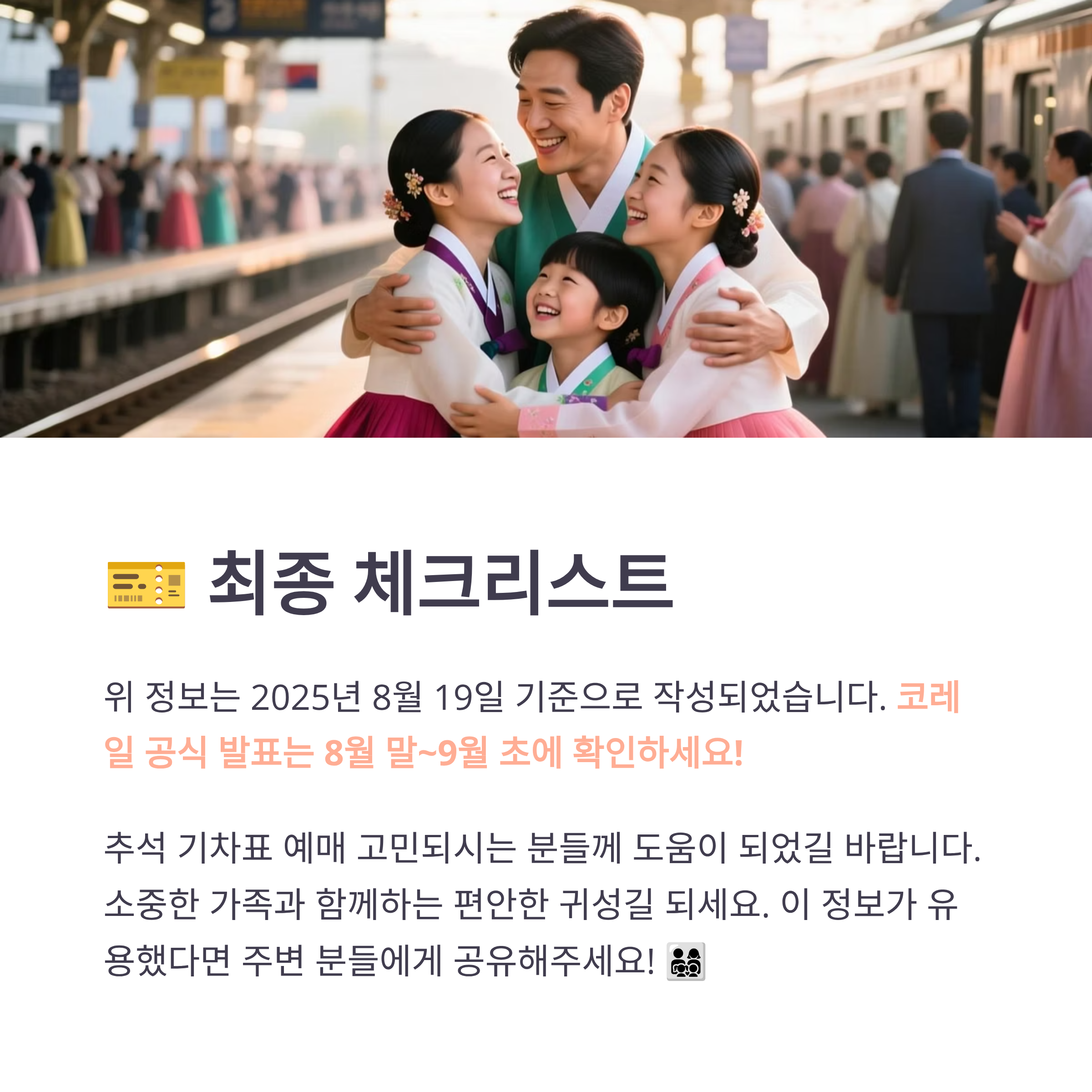 2025년 추석 연휴 코레일 승차권 예매는 8월 27~28일 양일간 진행될 가능성이 높습니다. 예매 첫 10분이 사실상 승부처이며, 좌석은 대부분 매진될 전망입니다. 사전 준비(회원가입, 시간 동기화, 결제수단 등록)를 꼼꼼히 해두어야 성공 확률을 높일 수 있습니다.