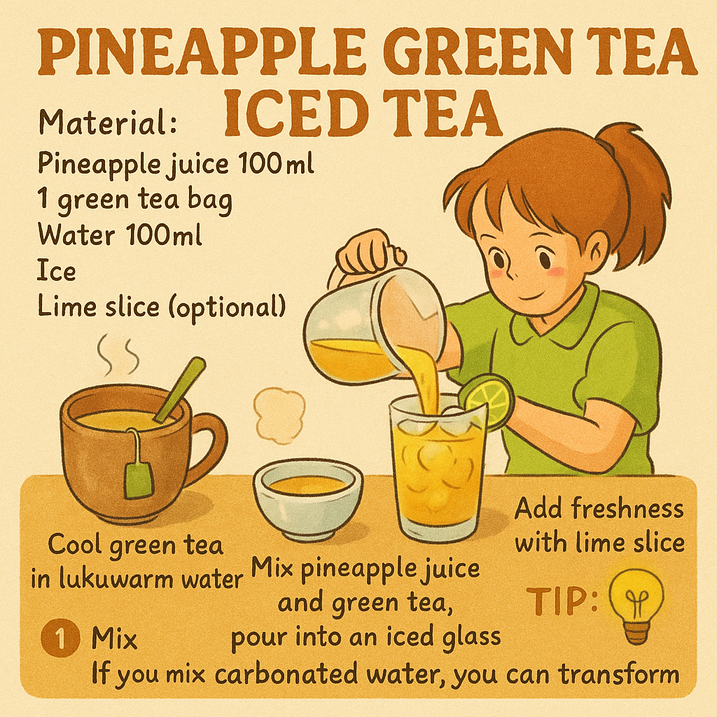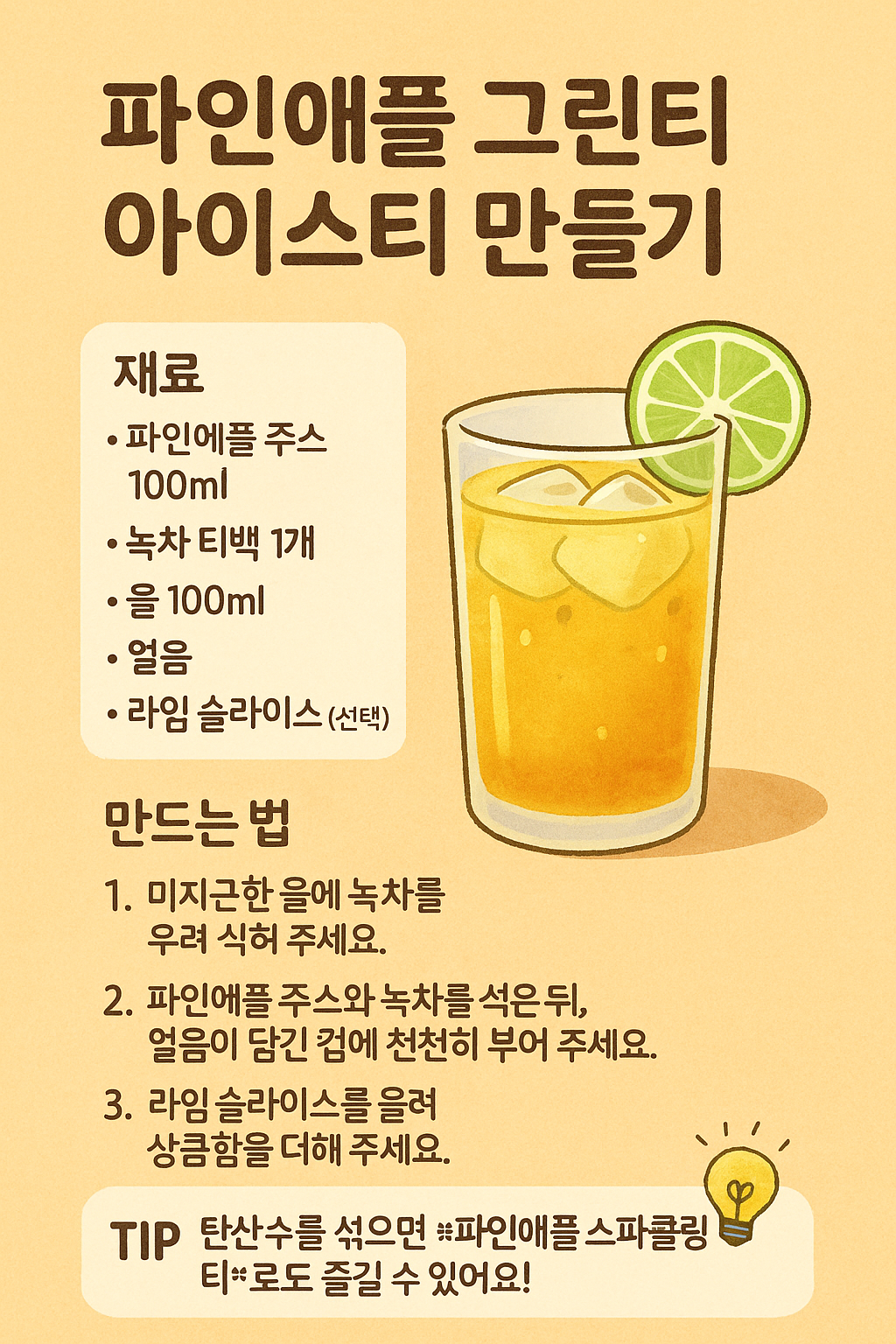 | 재료 | 파인애플 주스 100ml, 녹차 티백 1개, 물 100ml, 얼음, 라임 슬라이스 (선택) |