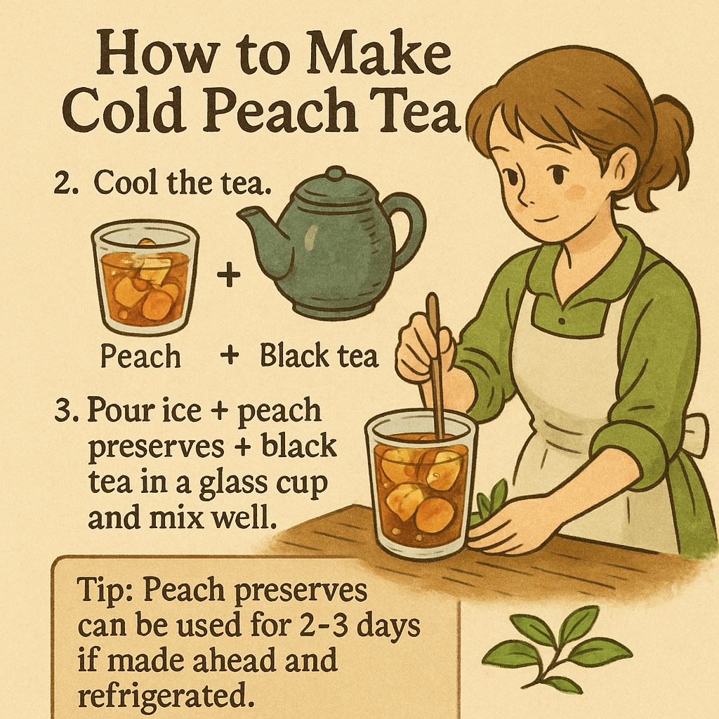 | 만드는 법 | 1. 복숭아를 슬라이스해 팬에 설탕과 함께 졸입니다. 2. 홍차를 진하게 우려 차갑게 식힙니다. 3. 유리컵에 얼음 + 복숭아청 + 홍차를 붓고 잘 섞습니다. |