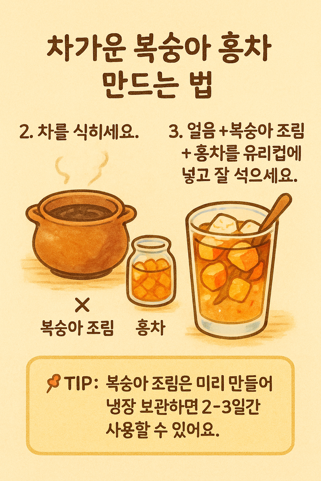 | 팁 | 복숭아청은 미리 만들어 냉장 보관하면 2~3일 사용 가능해요. |