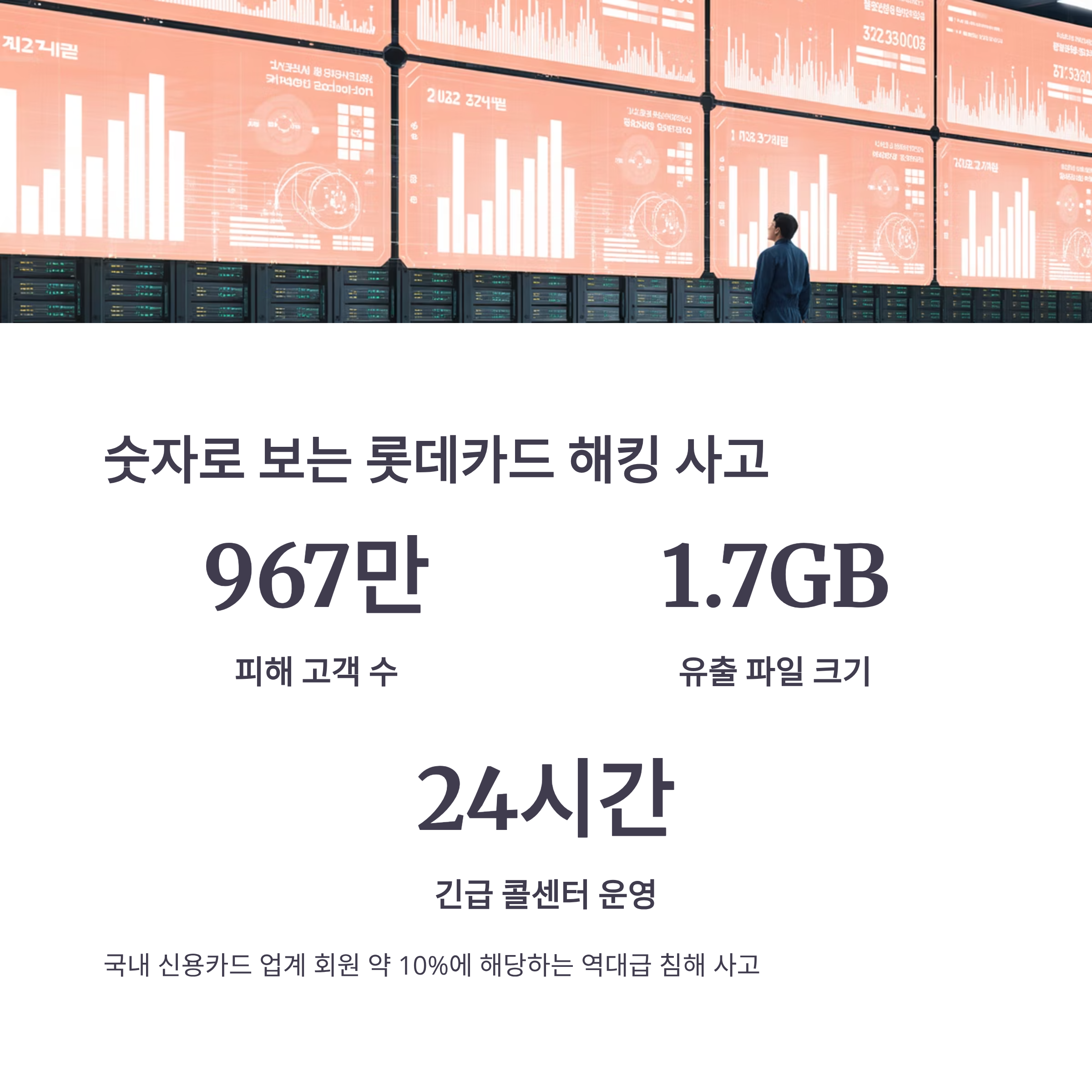 롯데카드 해킹 사건은 약 1.7GB의 데이터와 최대 967만 명의 개인정보가 유출된 초대형 보안 사고입니다.
