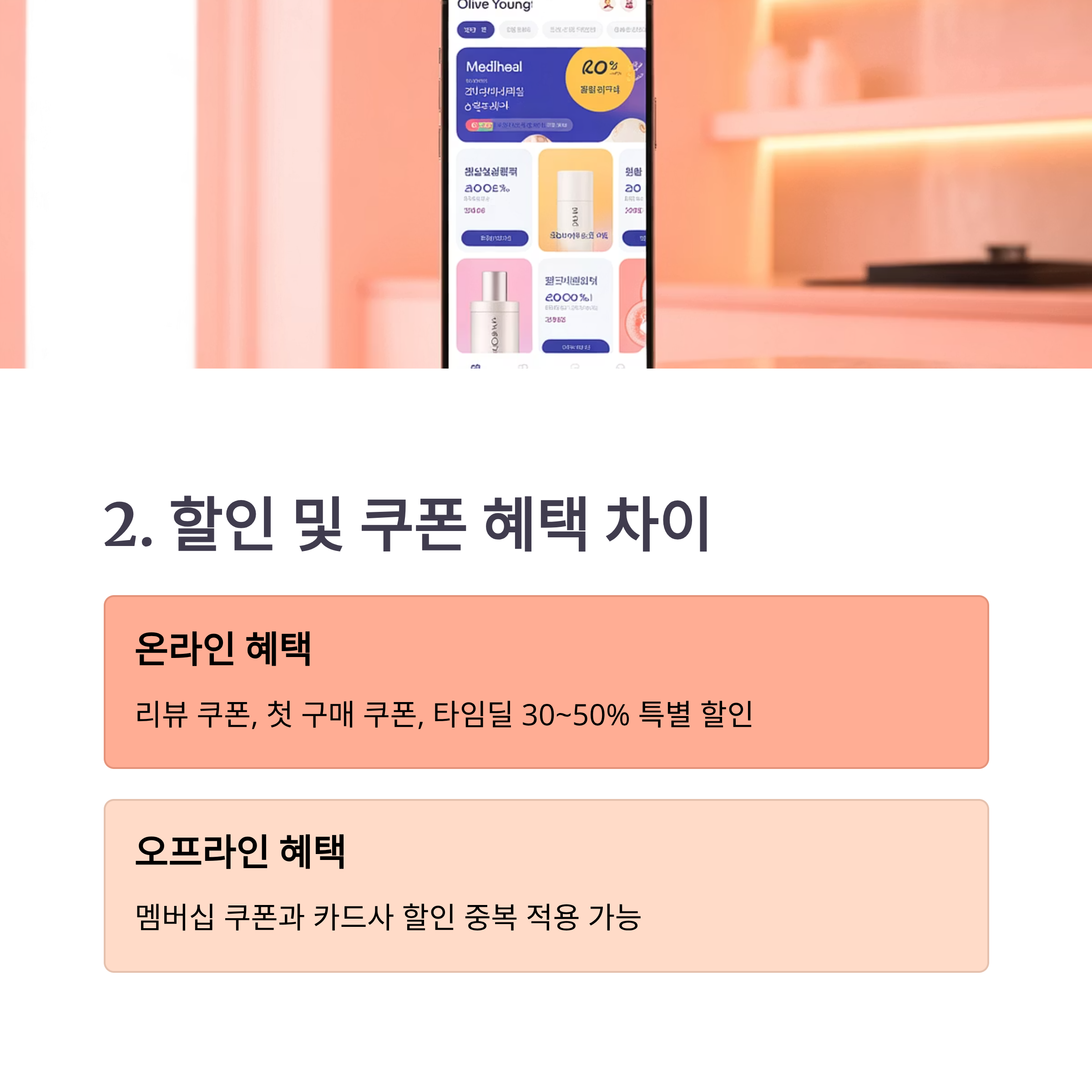 ✔️ 온라인몰: 리뷰 작성 쿠폰, 첫 구매 쿠폰, 앱 전용 쿠폰, 시간대별 타임딜 제공 → 온라인 쪽이 할인율이 크고 선택지가 다양함.