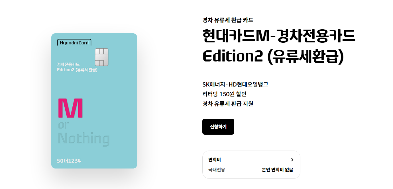 이 카드는 차종과 상관없이 발급 가능하며, 경차 유류세 환급 기능과 유류비 할인 혜택을 동시에 받을 수 있는 대표적인 신용카드예요. 현대오일뱅크 또는 SK에너지에서 주유 시 휘발유 및 경유는 리터당 150원 할인, LPG는 모든 충전소에서 동일 할인 혜택이 적용돼요.