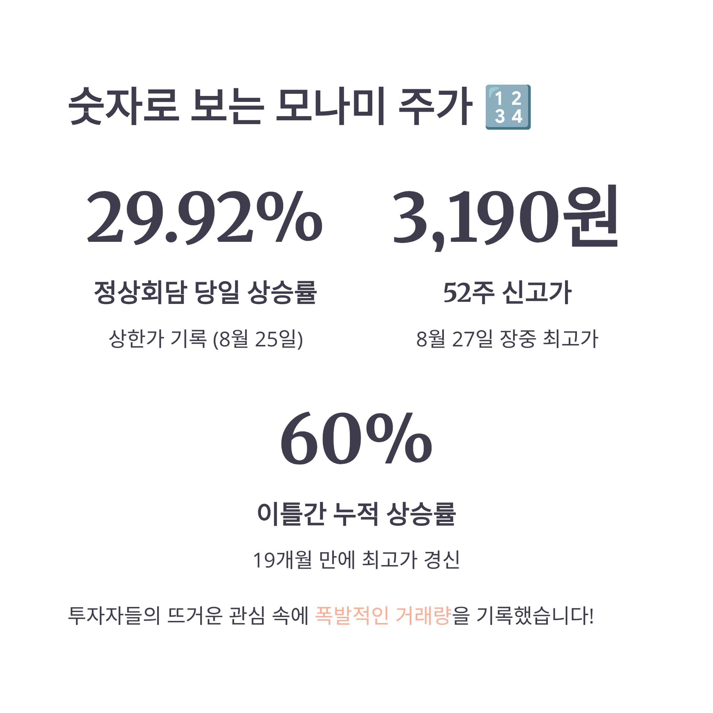 A. 8월 25일 상한가(29.92%)를 기록했고, 이틀간 누적 약 60% 이상 폭등했습니다.