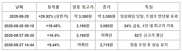 - 2025년 8월 27일 오전 9:30: 전일 대비 16.9% 상승, 52주 신고가 3,190원 돌파