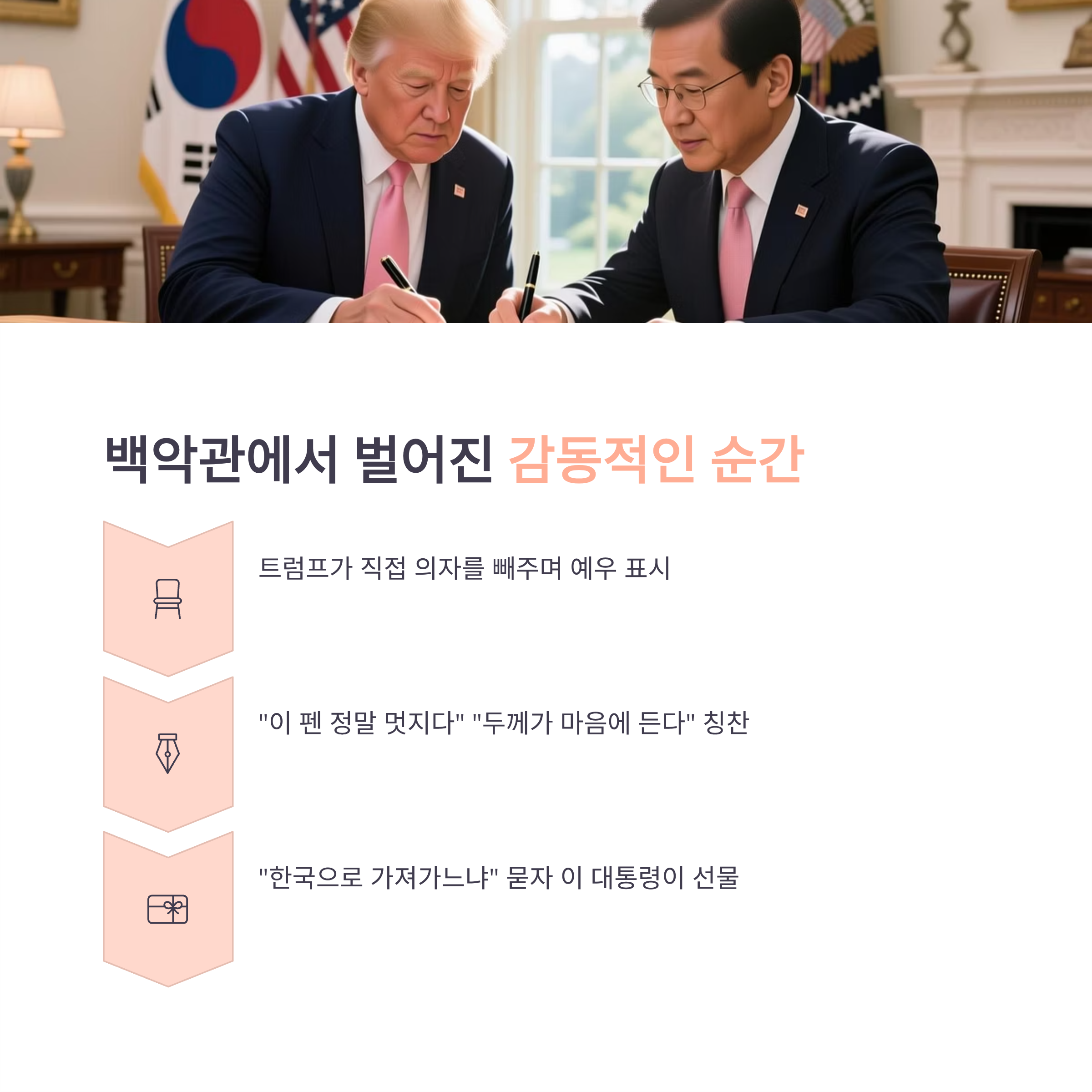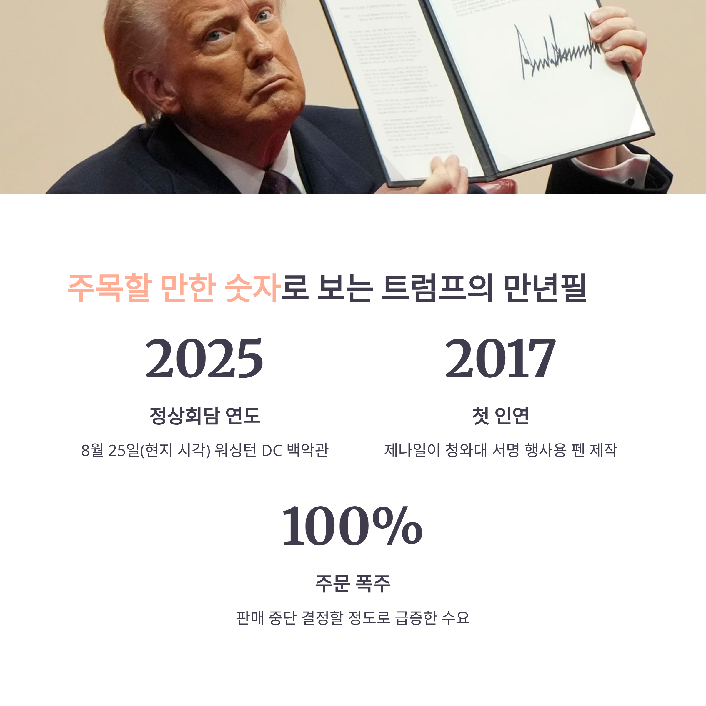 펜을 만져본 트럼프는 “정말 멋진 펜”이라며 감탄했고, “이 펜을 한국으로 가져가나요?”라고 묻기도 했습니다.