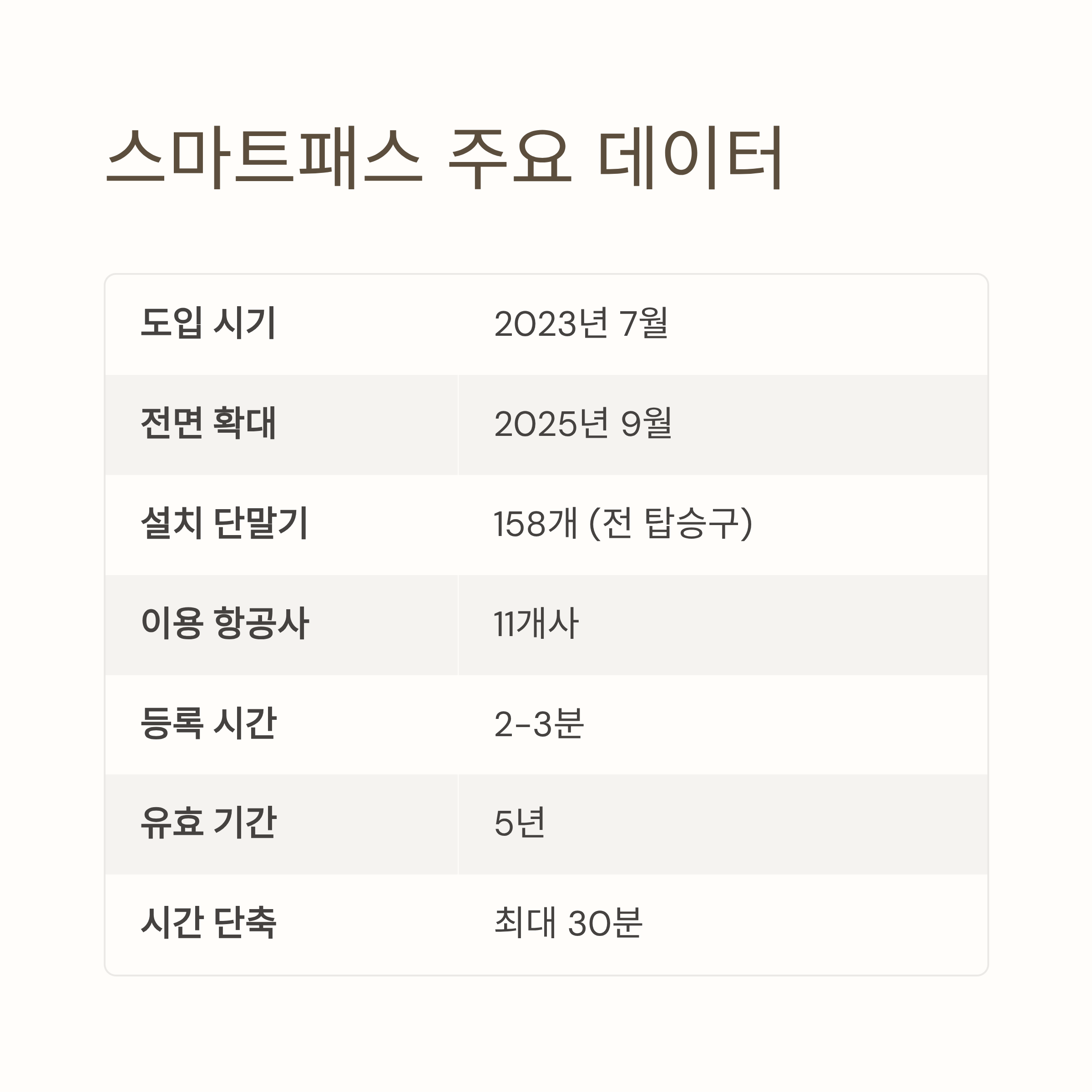 2023년 7월 국내 공항 최초로 도입된 스마트패스는 2025년 9월 기준 전 탑승구(158개)에 단말기 설치가 완료되었습니다.