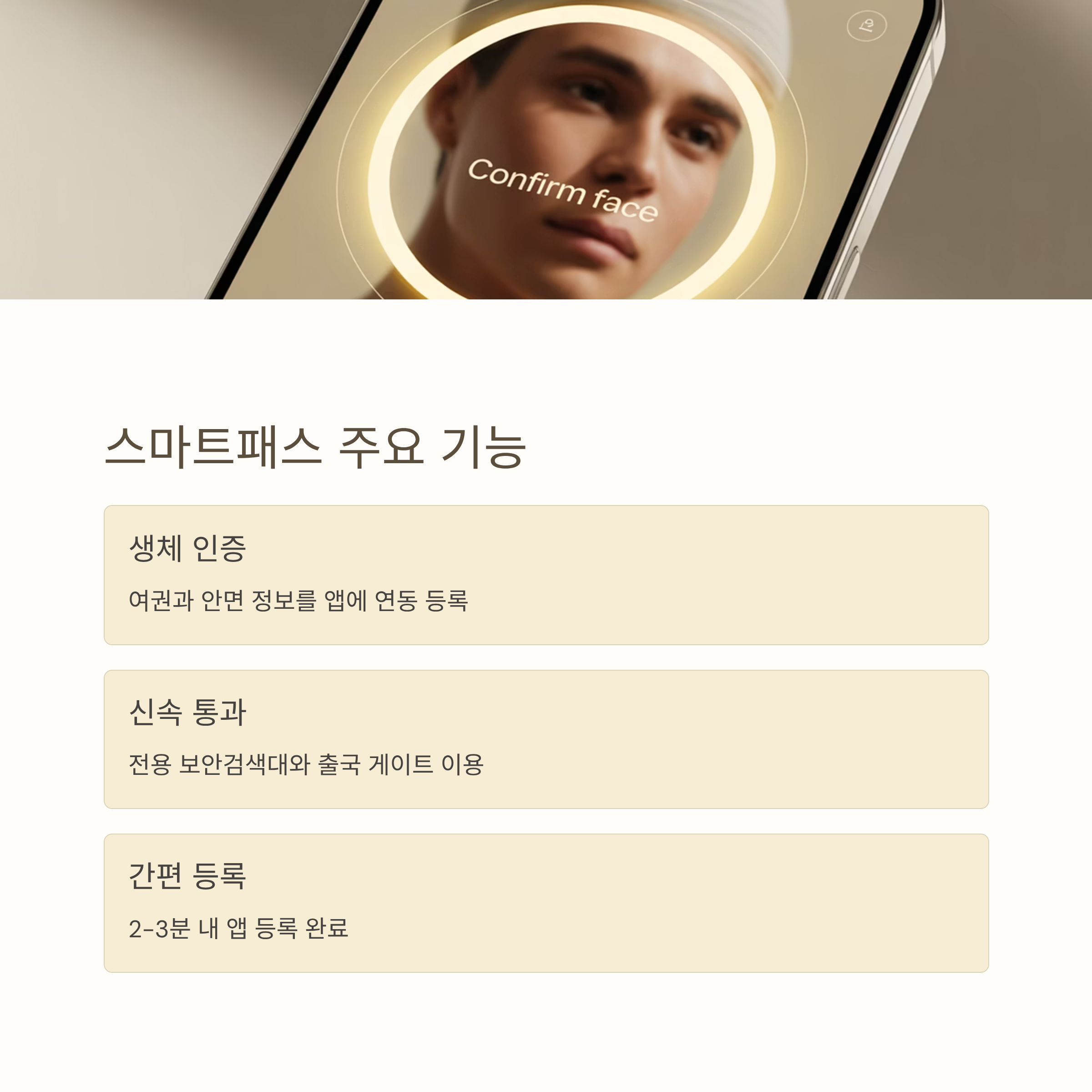 스마트패스는 여권과 안면 정보를 모바일 앱에 등록해 두면, 전용 보안검색대·출국 게이트·탑승구에서 신분 확인 절차 없이 통과할 수 있도록 지원합니다.