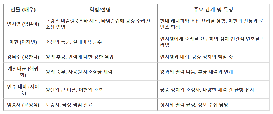 궁중 요리와 권력 구도가 맞물린 이 드라마는 각 캐릭터가 서로 다른 욕망과 신념으로 부딪히며 복합적인 서사를 만들어냅니다.