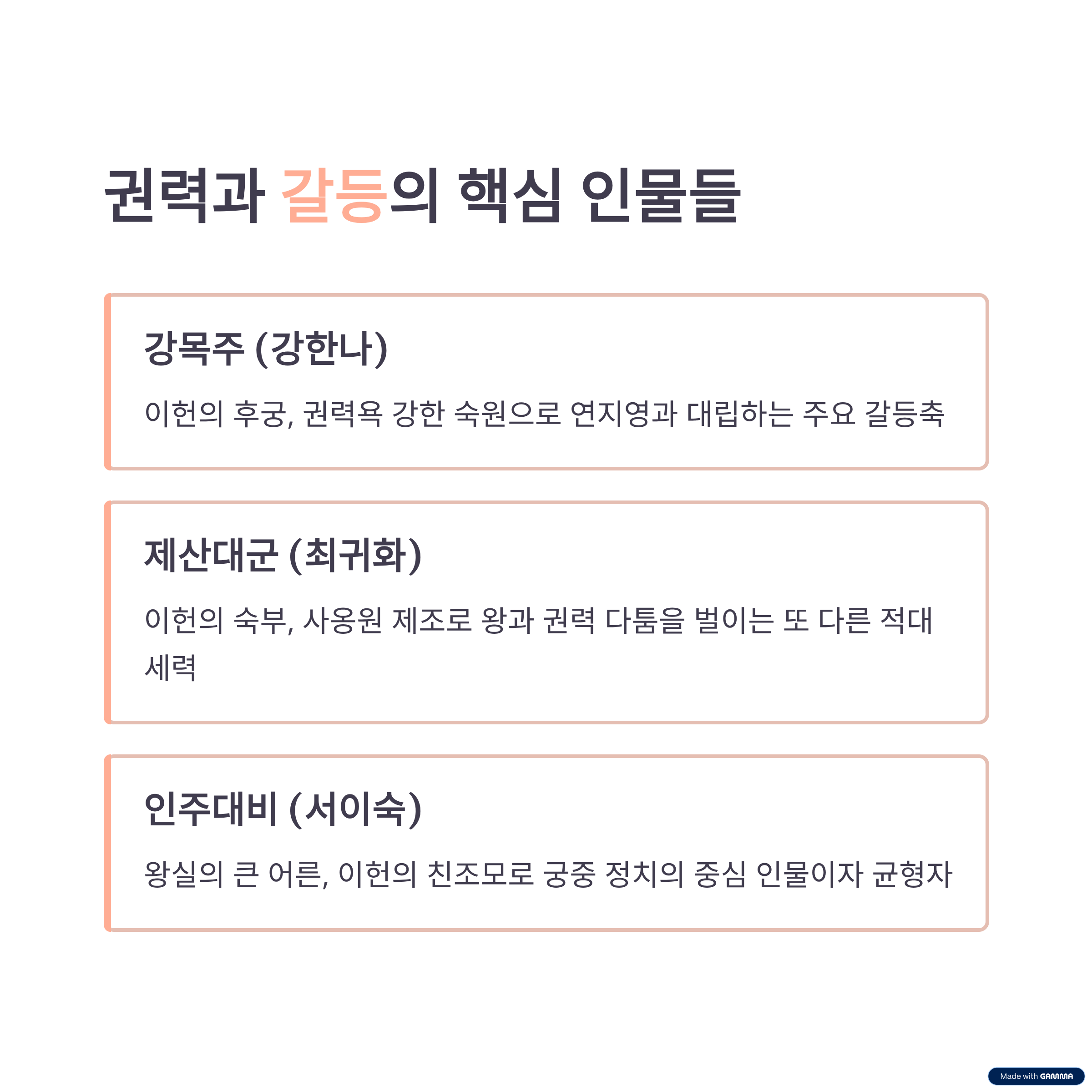 - 인주 대비와 임송재는 균형자 역할을 하며, 각 세력의 대립 속에서 긴장감을 조율합니다.
