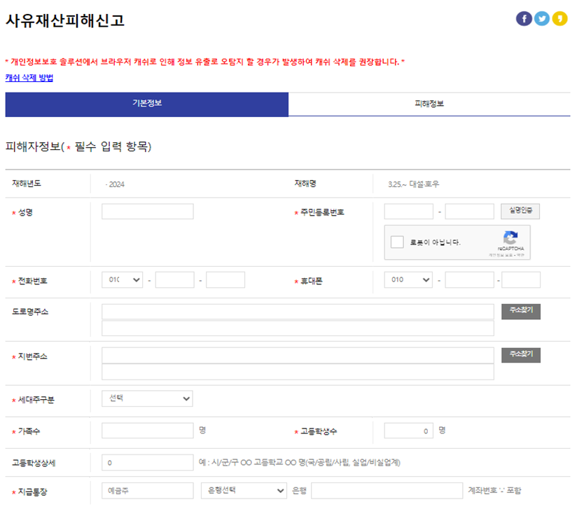 | 제출 서류 | 신분증, 피해 현장 사진, 관련 증빙 자료 |