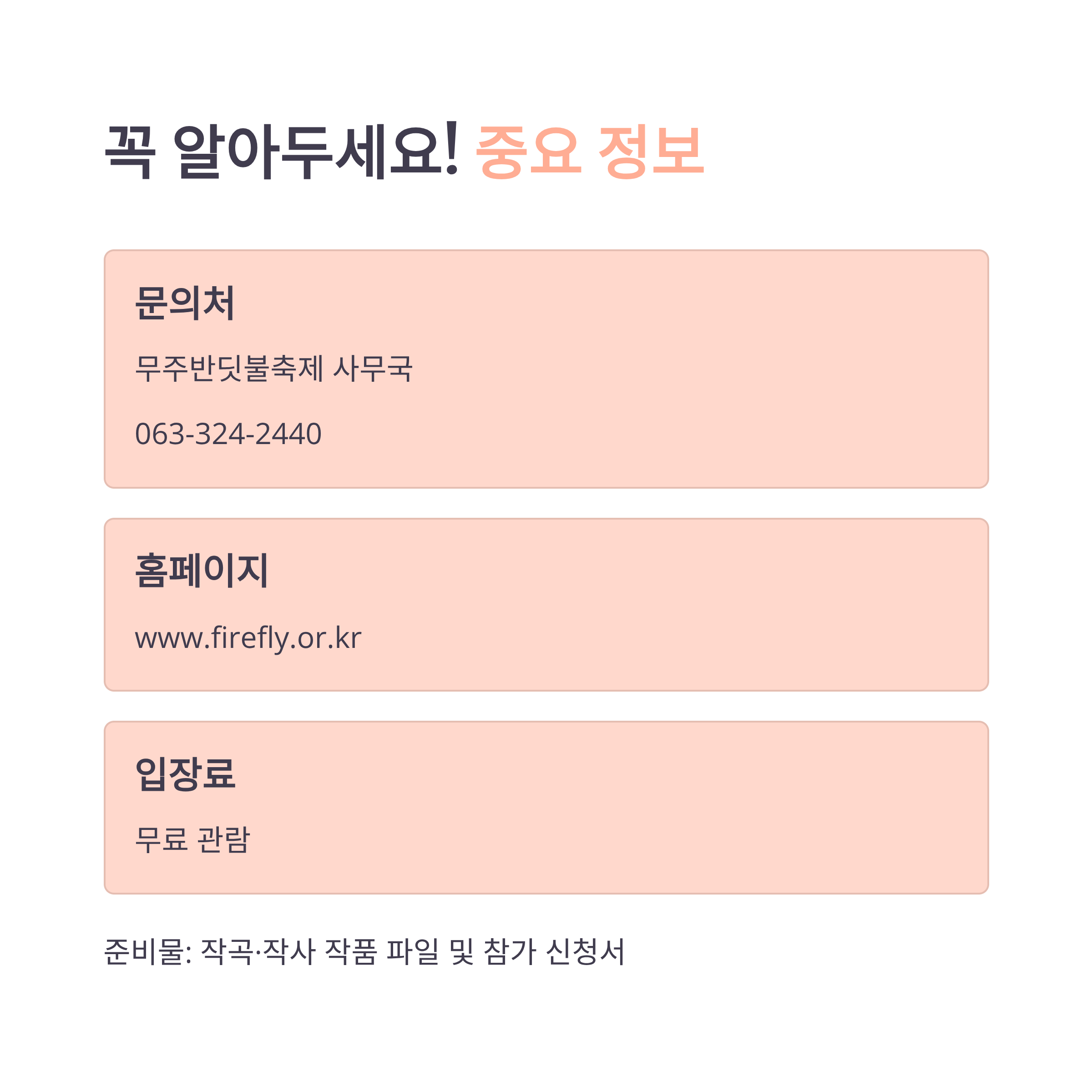 - 문의: 무주반딧불축제 사무국 (063-324-2440), 전주방송(JTV) 문화센터