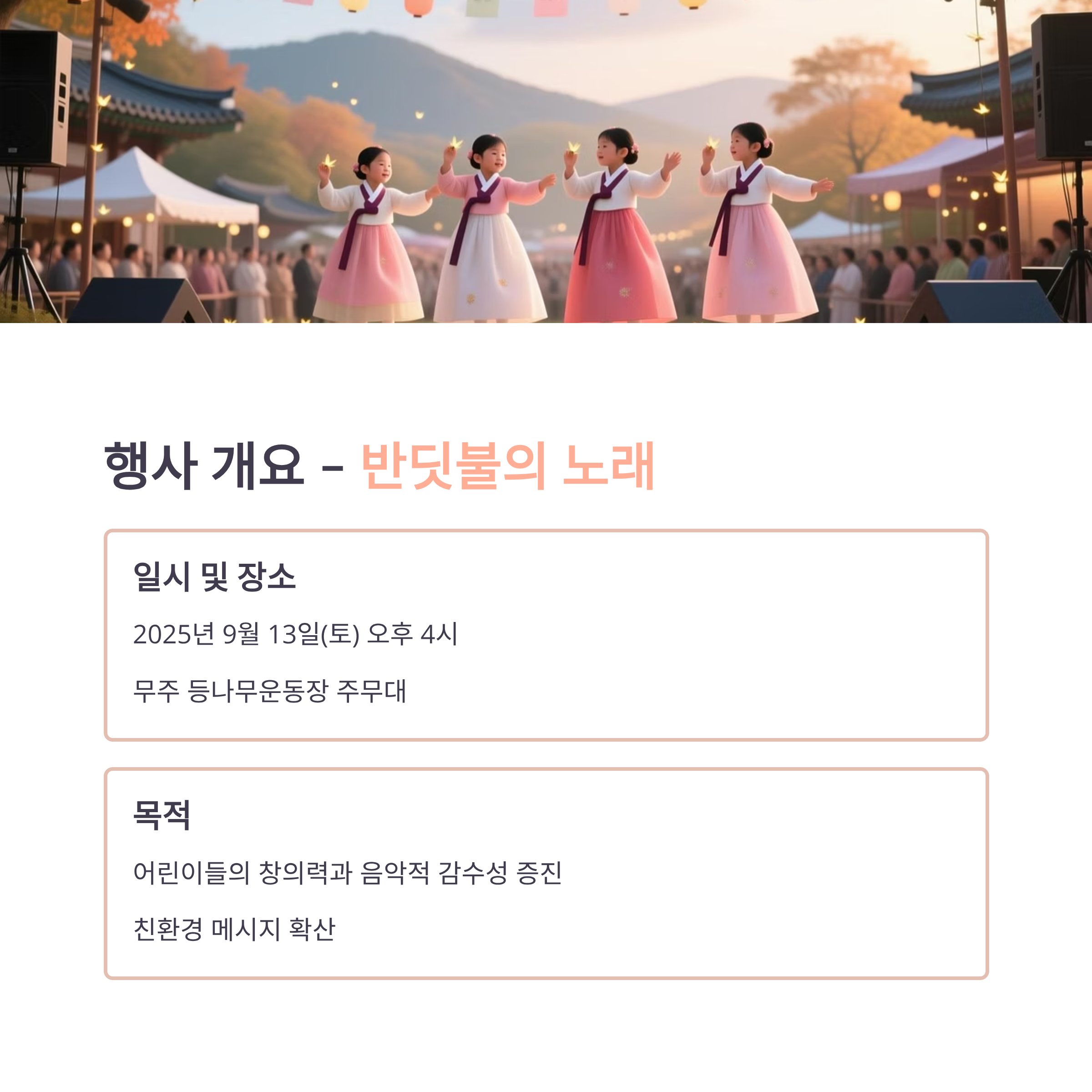 - 목적: 어린이들의 창의력과 음악적 감성 증진, 반딧불축제를 통한 친환경 메시지 확산