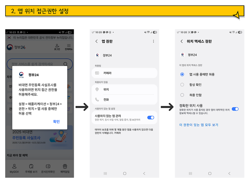 - [설정] > [앱] > [정부24] > [권한] > '위치 권한'을 '항상 허용'으로 설정