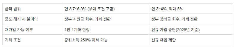 정부 정책은 매년 조정되므로, 가입 전 본인의 소득, 자산 상태, 향후 계획을 충분히 고려하고 금융기관의 상품별 조건도 반드시 비교 확인하시기 바랍니다.