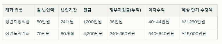 이 두 상품은 지원 방식, 만기, 혜택, 가입 조건 등에서 상당한 차이를 보이며, 본인의 소득 수준과 자산 목표에 따라 선택이 달라져야 합니다.