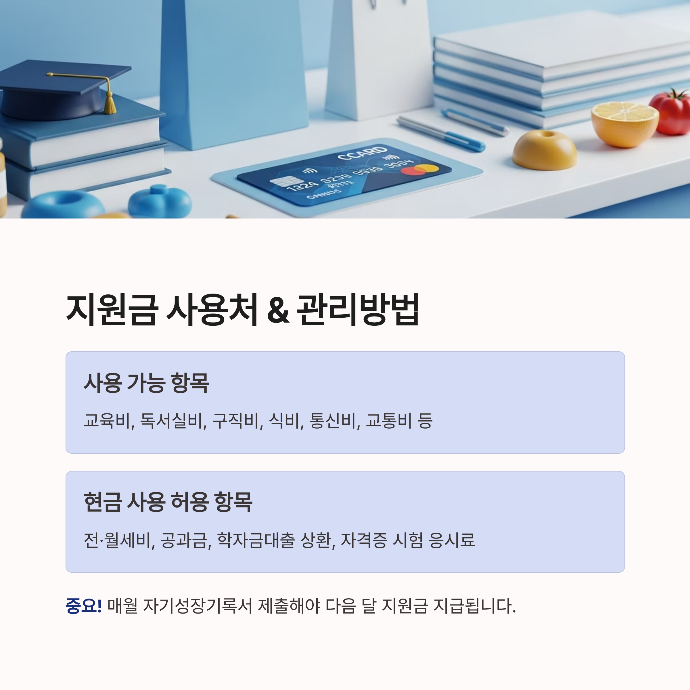 지원금은 체크카드로 지급되며, 교육비, 식비, 통신비, 교통비 등 구직활동 및 생활안정에 필요한 항목에 사용 가능합니다.