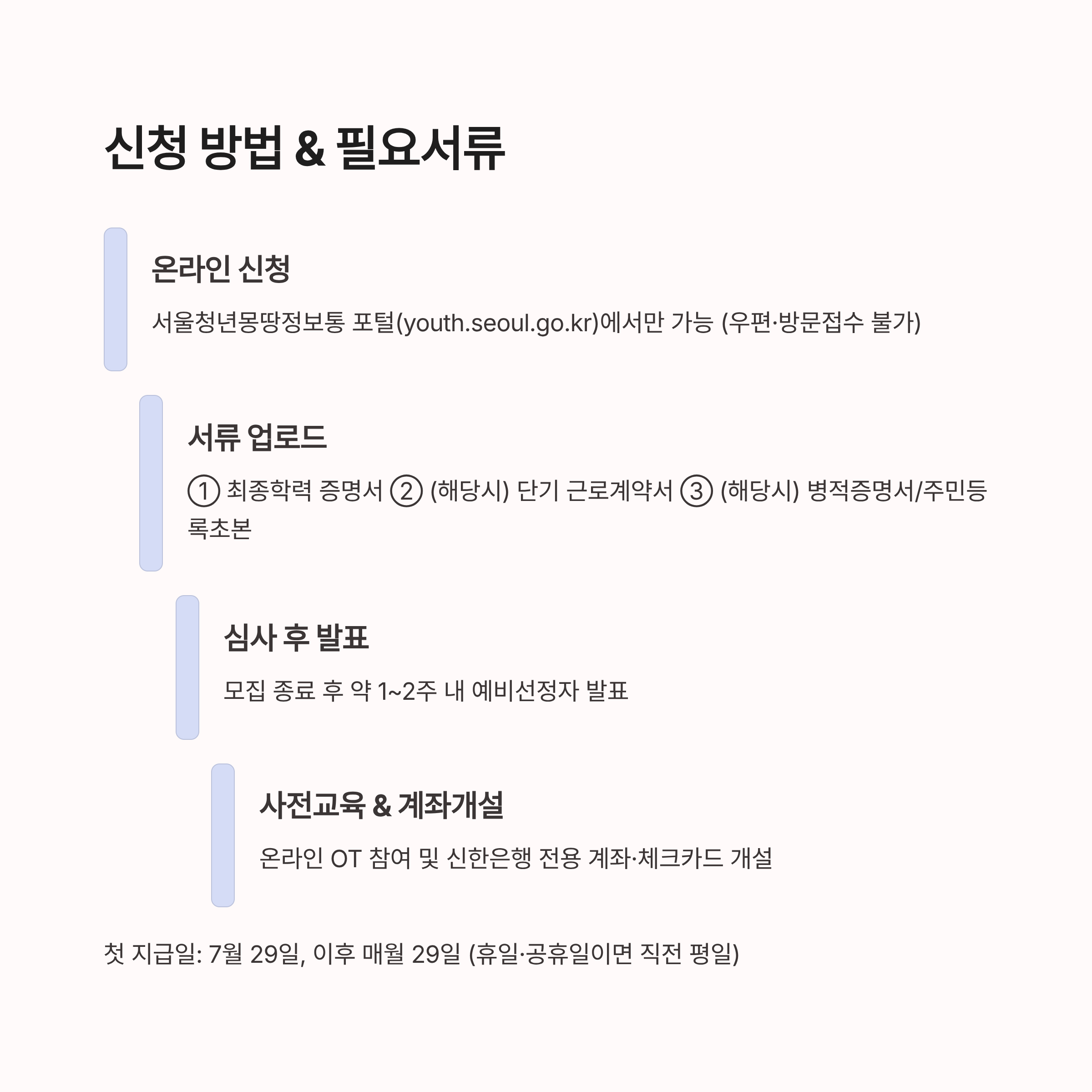 신청은 ‘서울청년몽땅정보통’ 포털에서 온라인으로만 가능합니다. 우편이나 방문 접수는 불가합니다.
