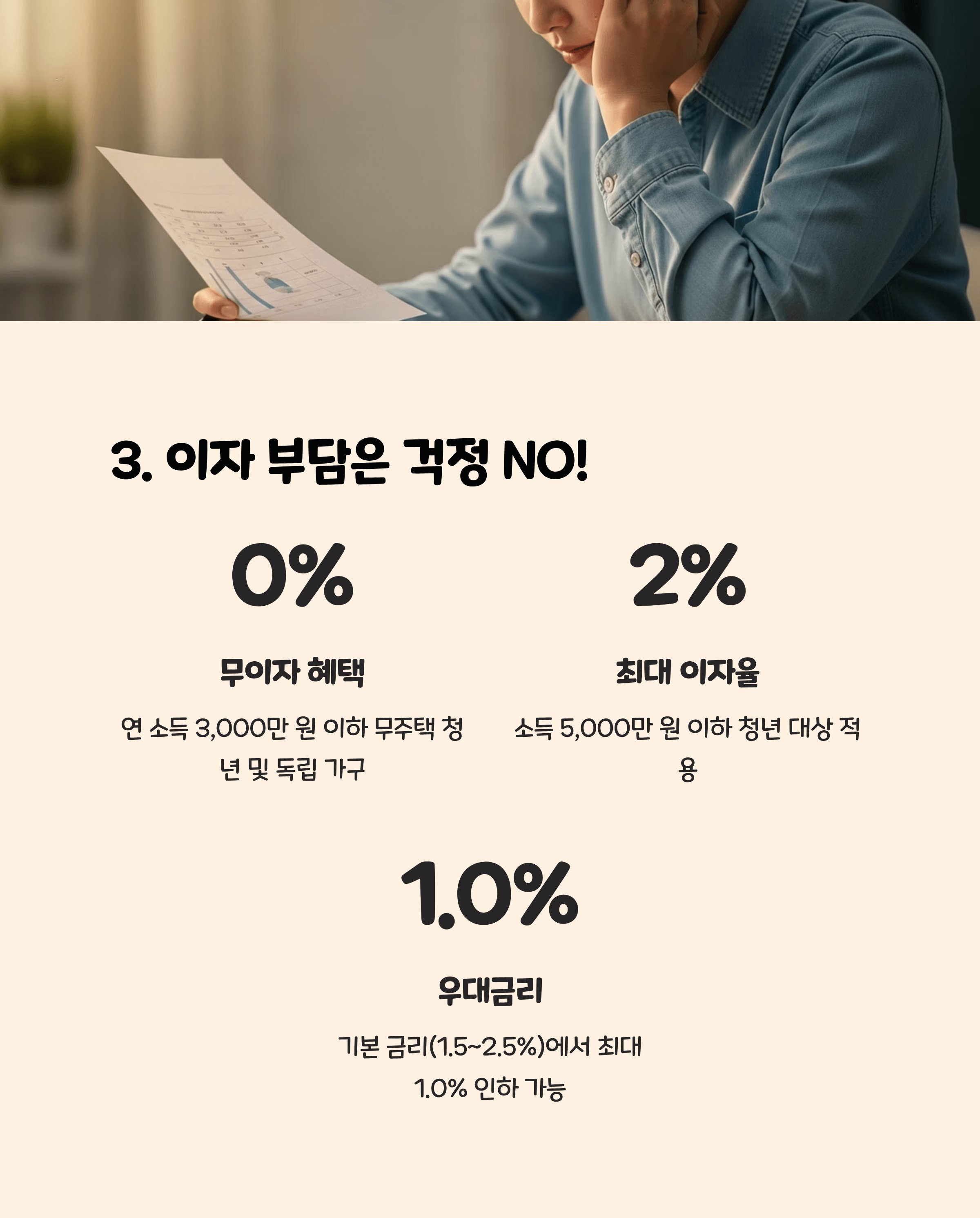 기초생활 수급자, 차상위계층, 연소득 3,000만 원 이하 청년은 **무이자 대출**도 가능합니다.