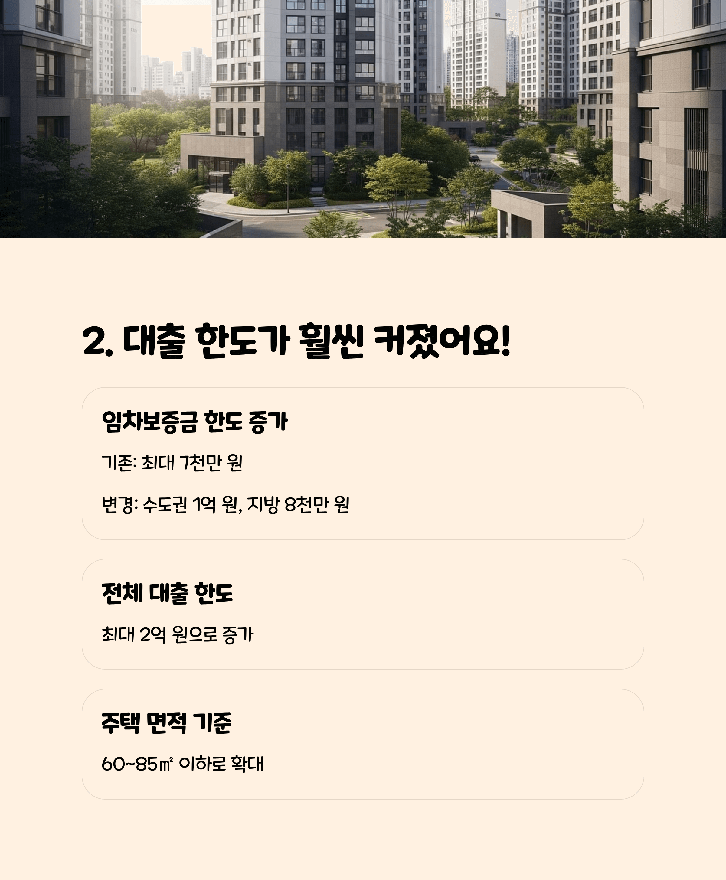 총 대출 한도는 최대 2억 원까지로 늘어나, 현실적인 주거 공간 확보에 큰 도움이 됩니다.