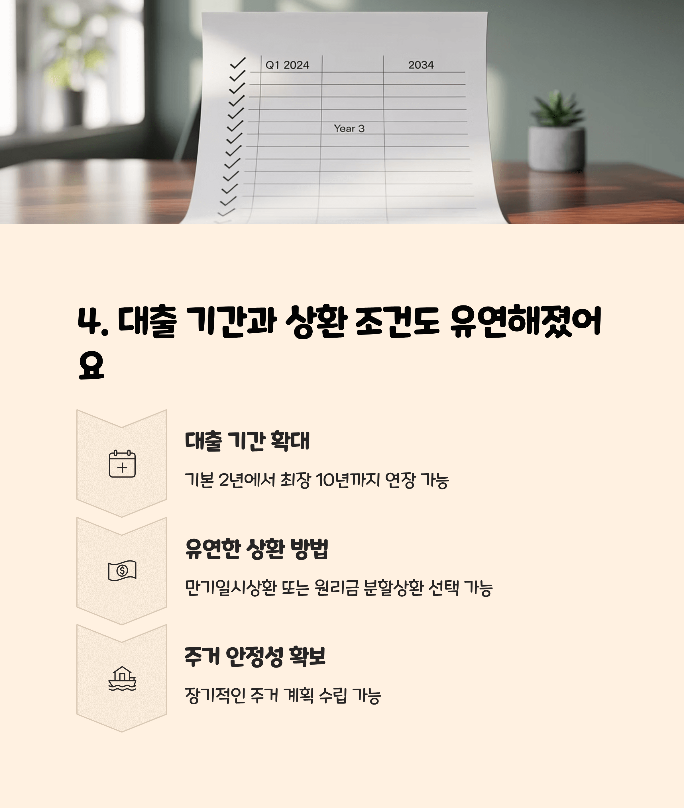 기존에는 2년 단위 갱신만 가능했던 대출 기간이 이제는 **최장 10년까지 연장**이 가능합니다.