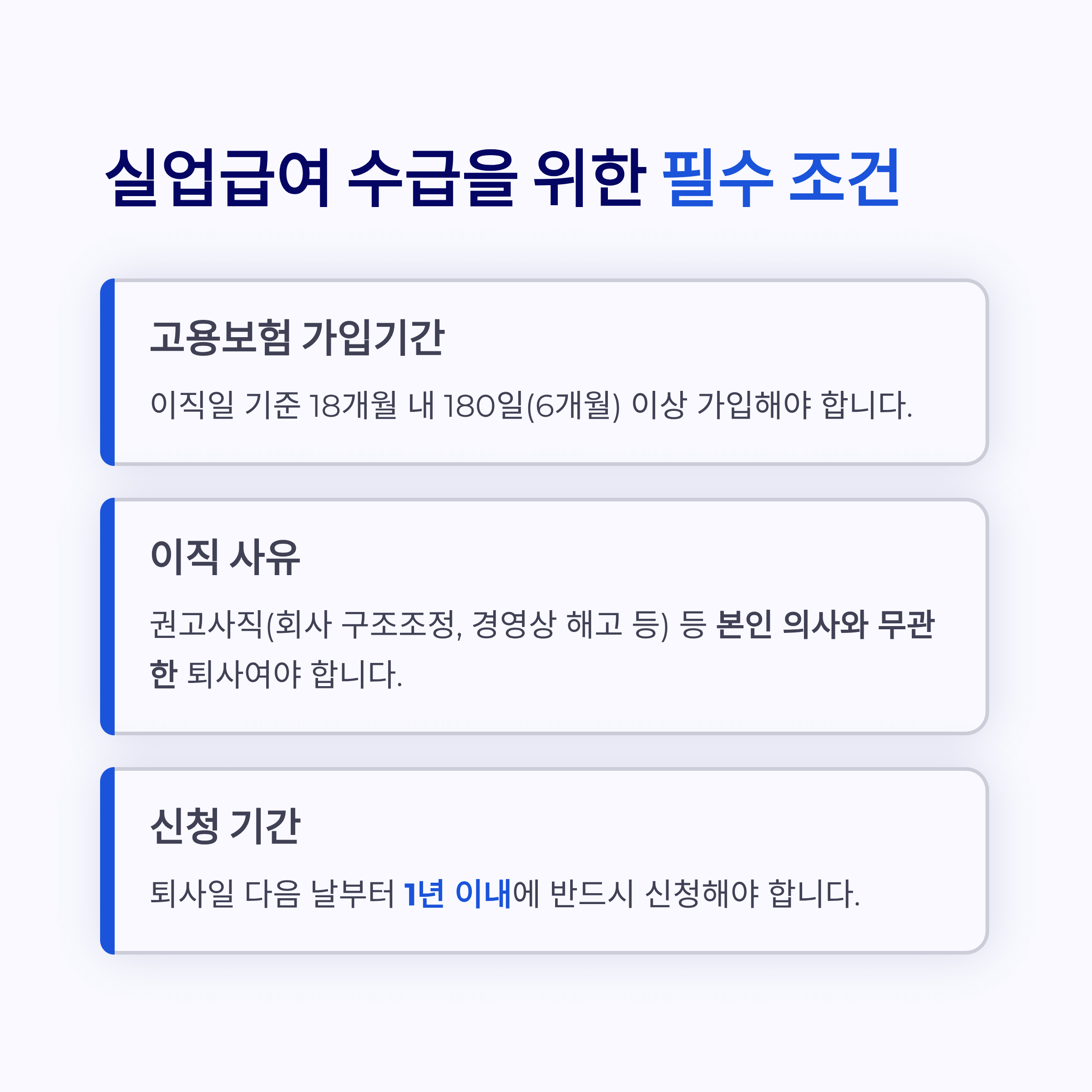 - 고용보험 가입기간 : 퇴직일 기준 최근 18개월 안에 180일(6개월) 이상 가입