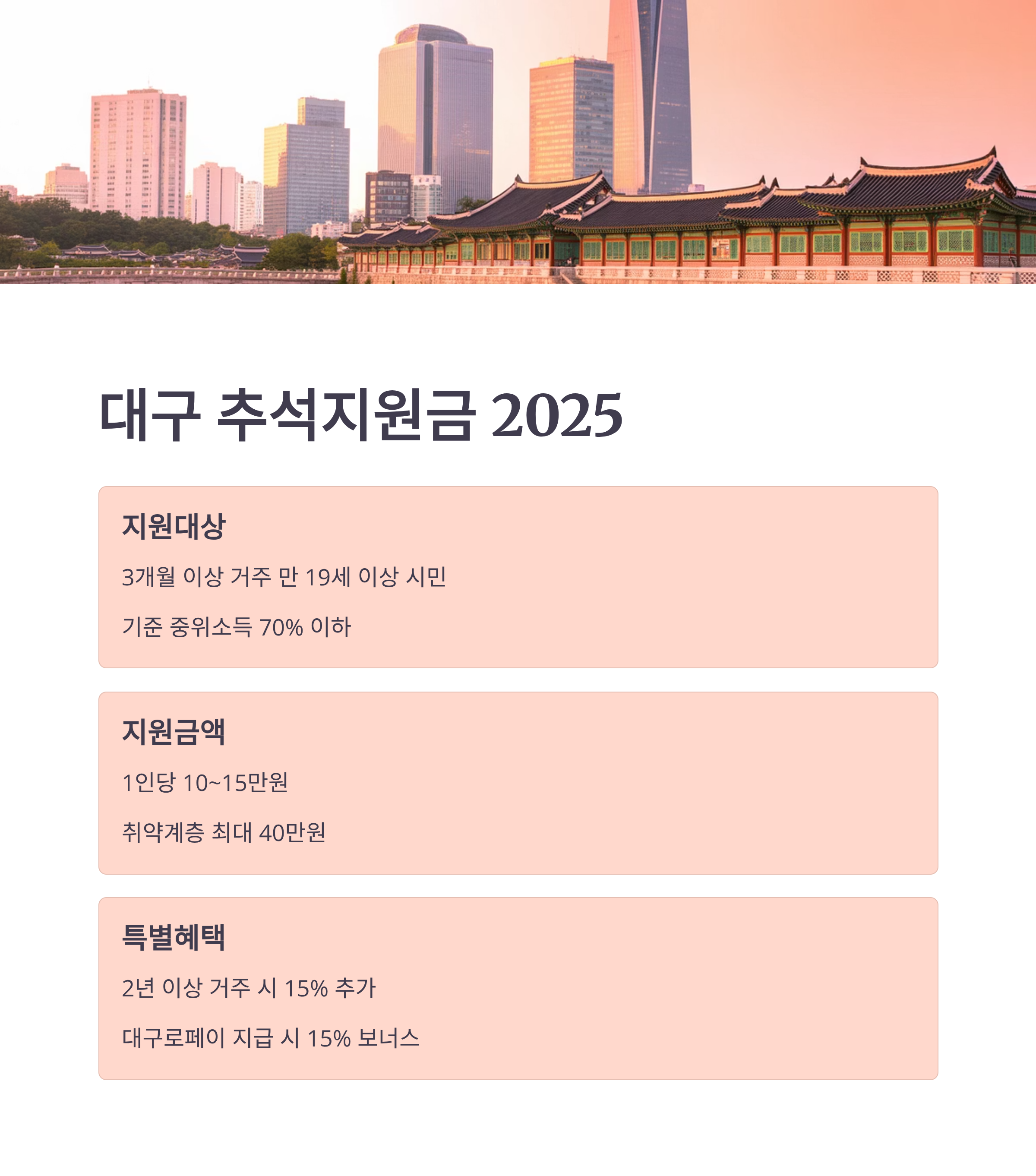 2025년 추석을 맞아 대구, 부산, 수원 등 주요 지자체에서 시민들의 명절 부담을 덜기 위한 추석 지원금 정책을 발표했습니다.