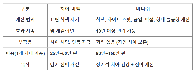 - 심한 변색, 치아 균열·형태 이상·화이트 스팟 → 미니쉬 권장.