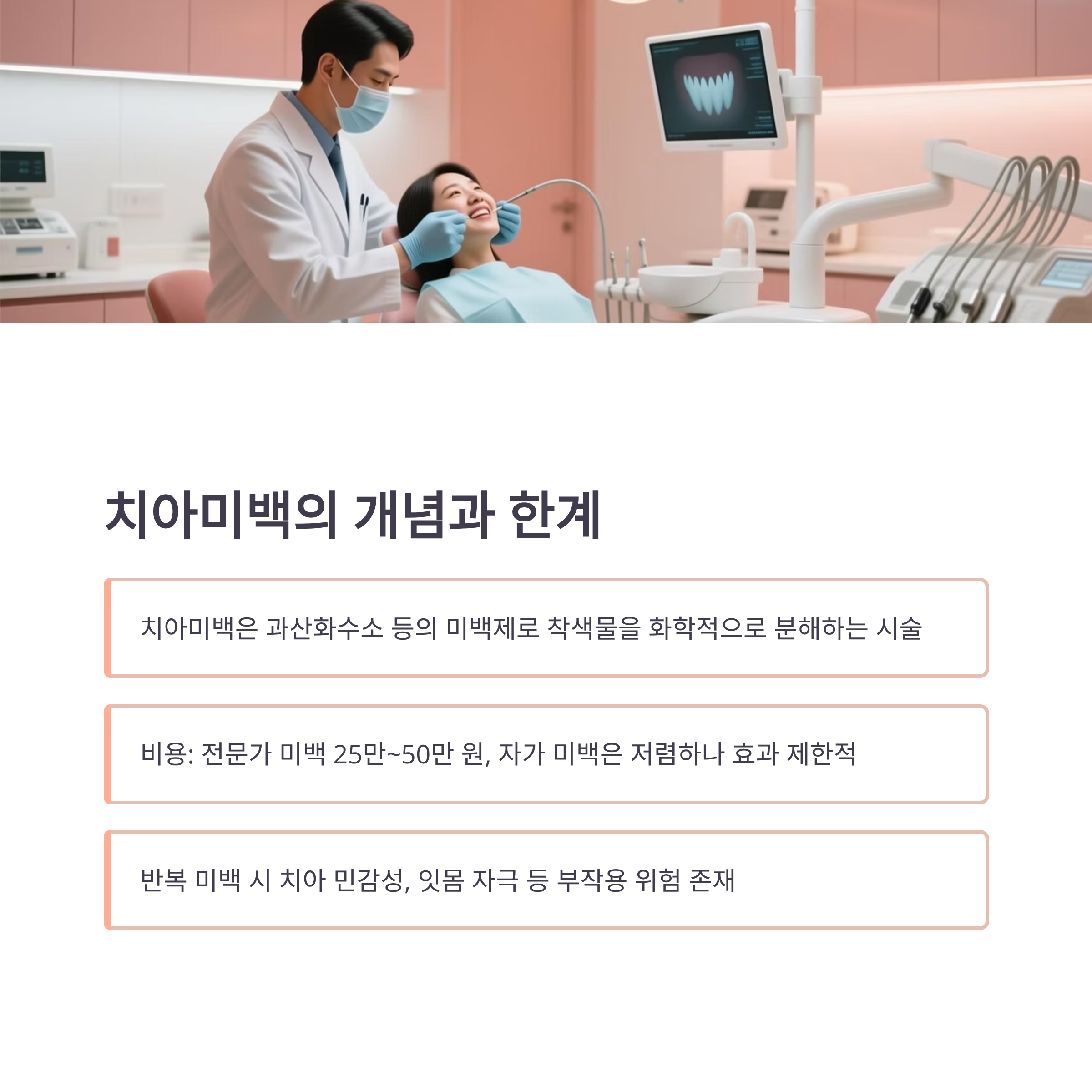 - 반복 미백 시 치아 시림·잇몸 자극 부작용 위험.