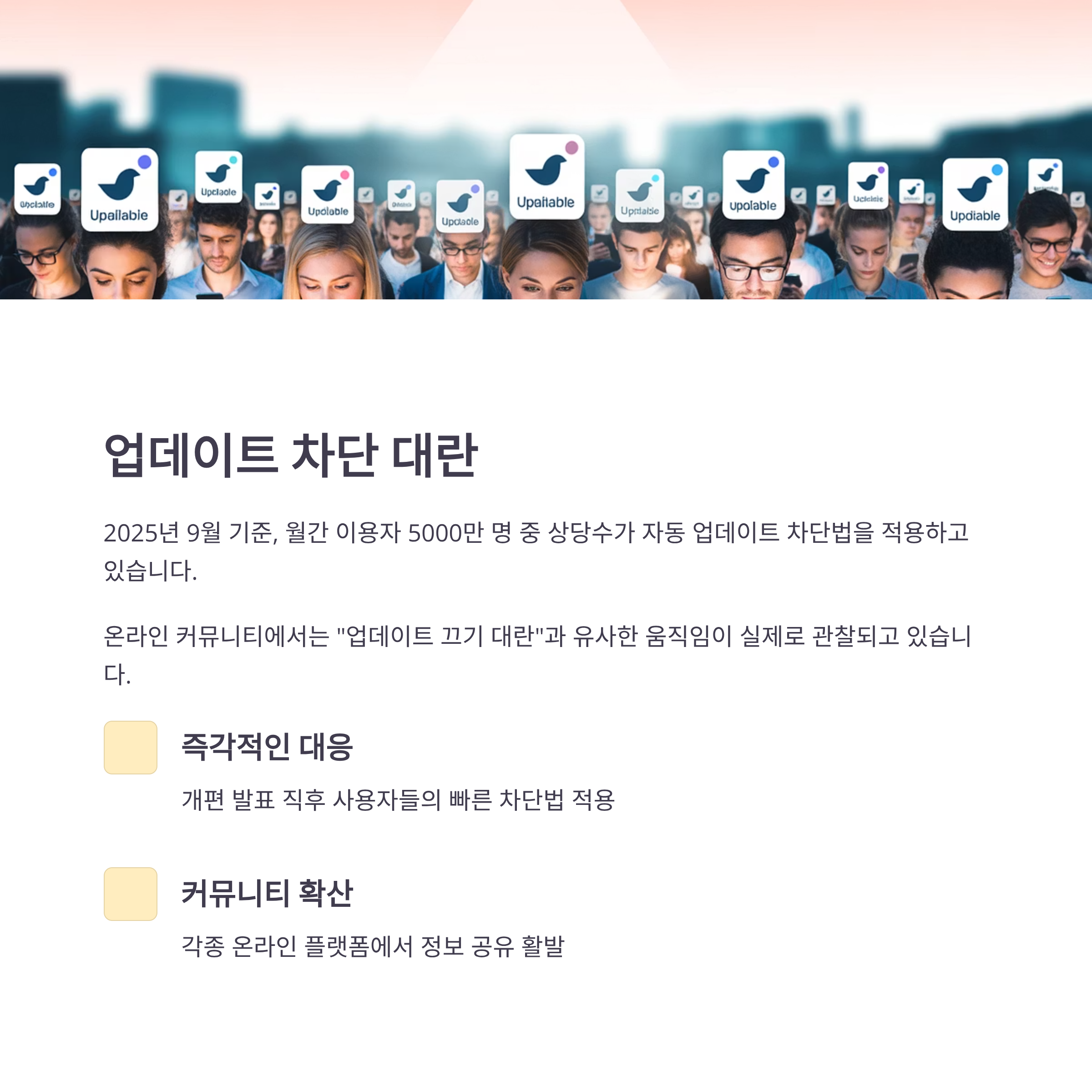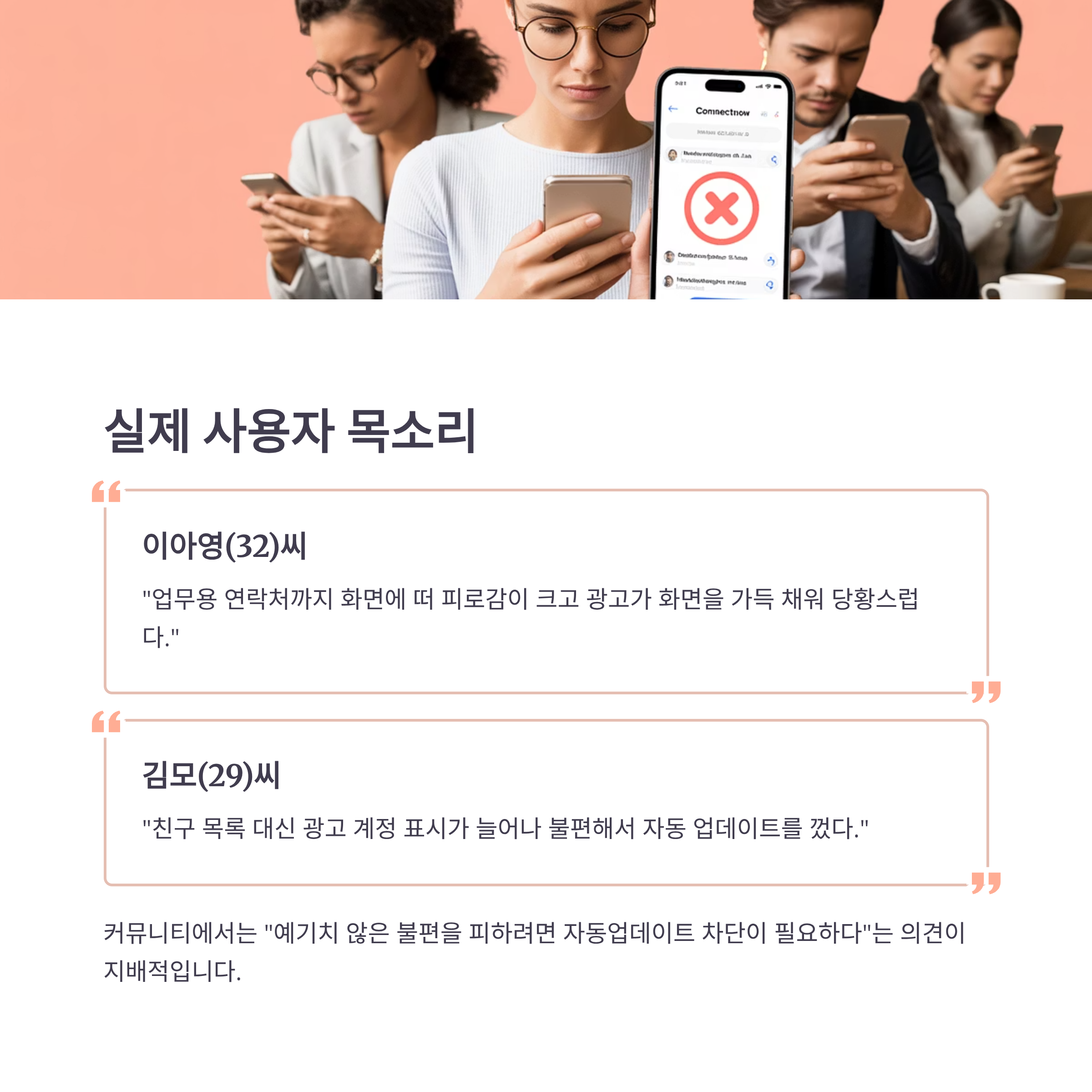 ✔️ 김모 씨(29세, 디자이너): “업데이트 후 광고가 화면 절반을 차지해서 불편했어요. 업데이트 차단 후 훨씬 쾌적해졌습니다.”