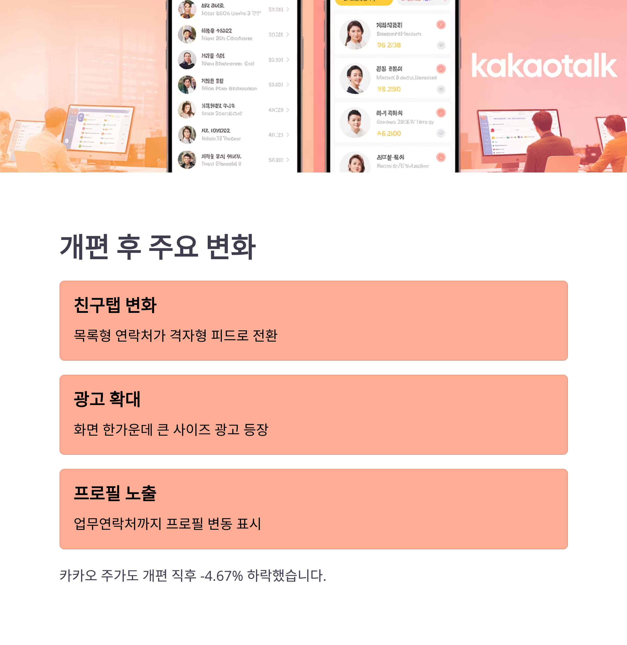 2025년 9월 23일, 카카오톡은 친구 목록을 SNS 피드 형태로 바꾸고 광고를 정중앙에 배치하는 등 대규모 개편을 단행했습니다. 이에 따라 많은 사용자들이 “업무 연락처까지 노출되어 불편하다”, “관심 없는 지인의 게시물이 계속 뜬다” 등의 이유로 불편을 호소하고 있습니다.