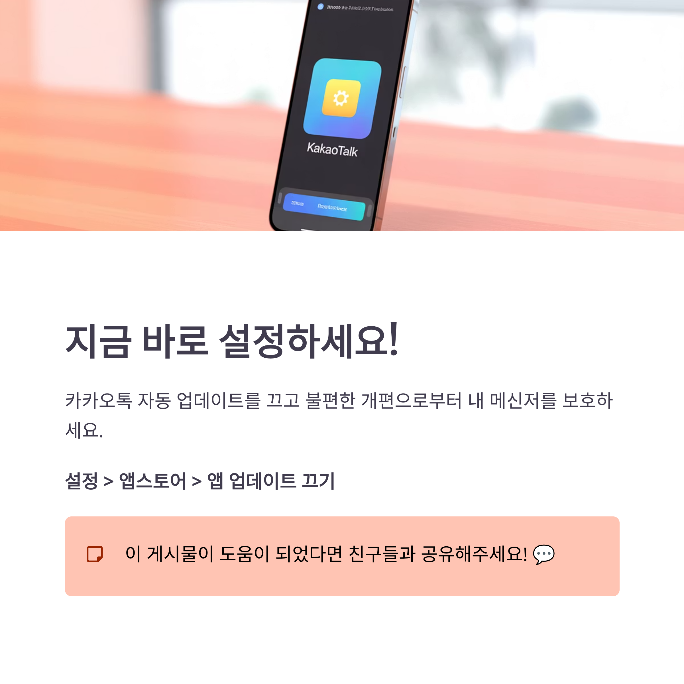 이 글을 읽고 있다면 지금 당장 설정 앱으로 이동해 '앱 업데이트' 항목을 확인해보세요. 당신의 카카오톡 환경이 훨씬 더 안정적으로 유지될 것입니다.