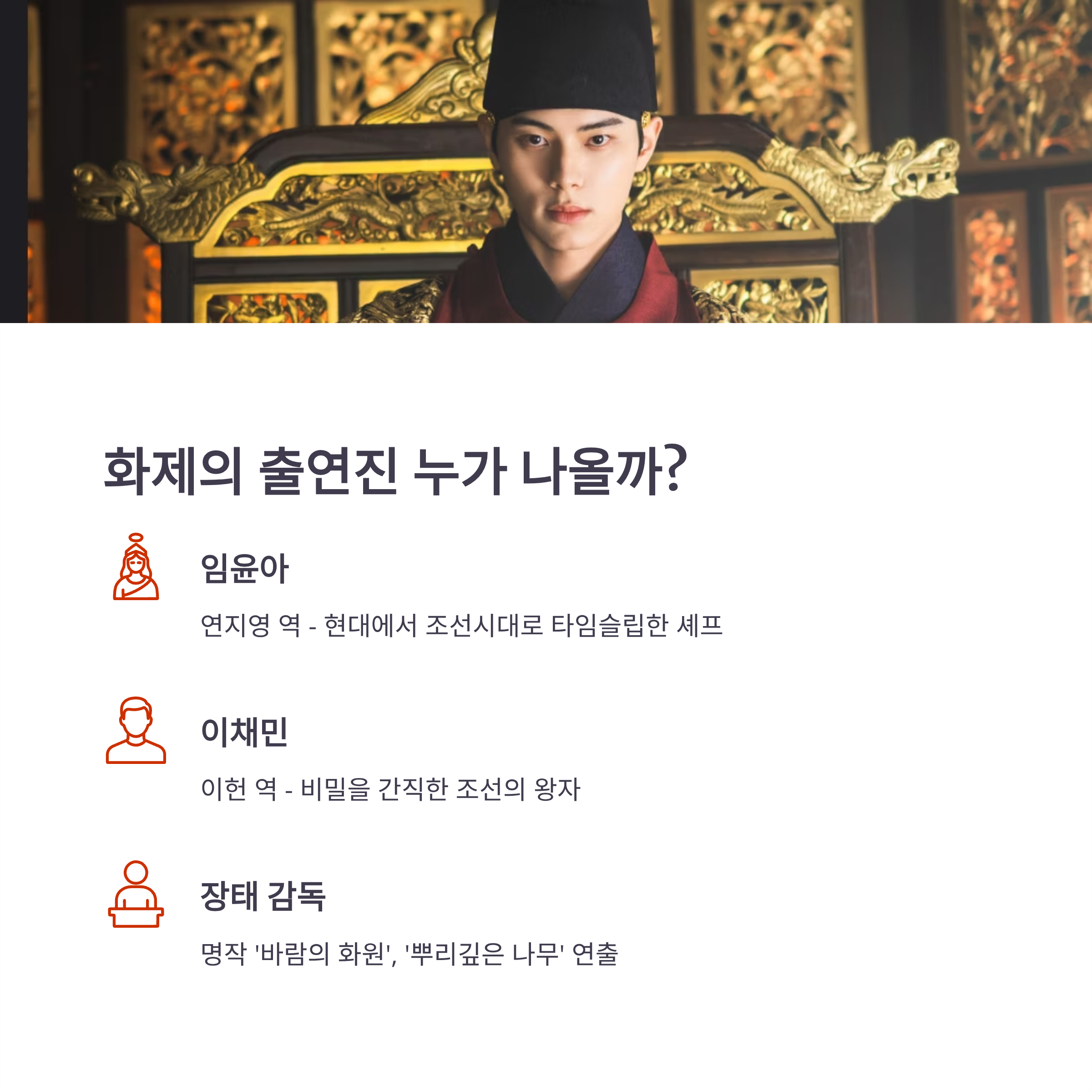 - 임윤아 : ‘연지영’ 역 - 이채민 : ‘이헌’ 역 - 강한나 : 궁중 내 권력자 역할