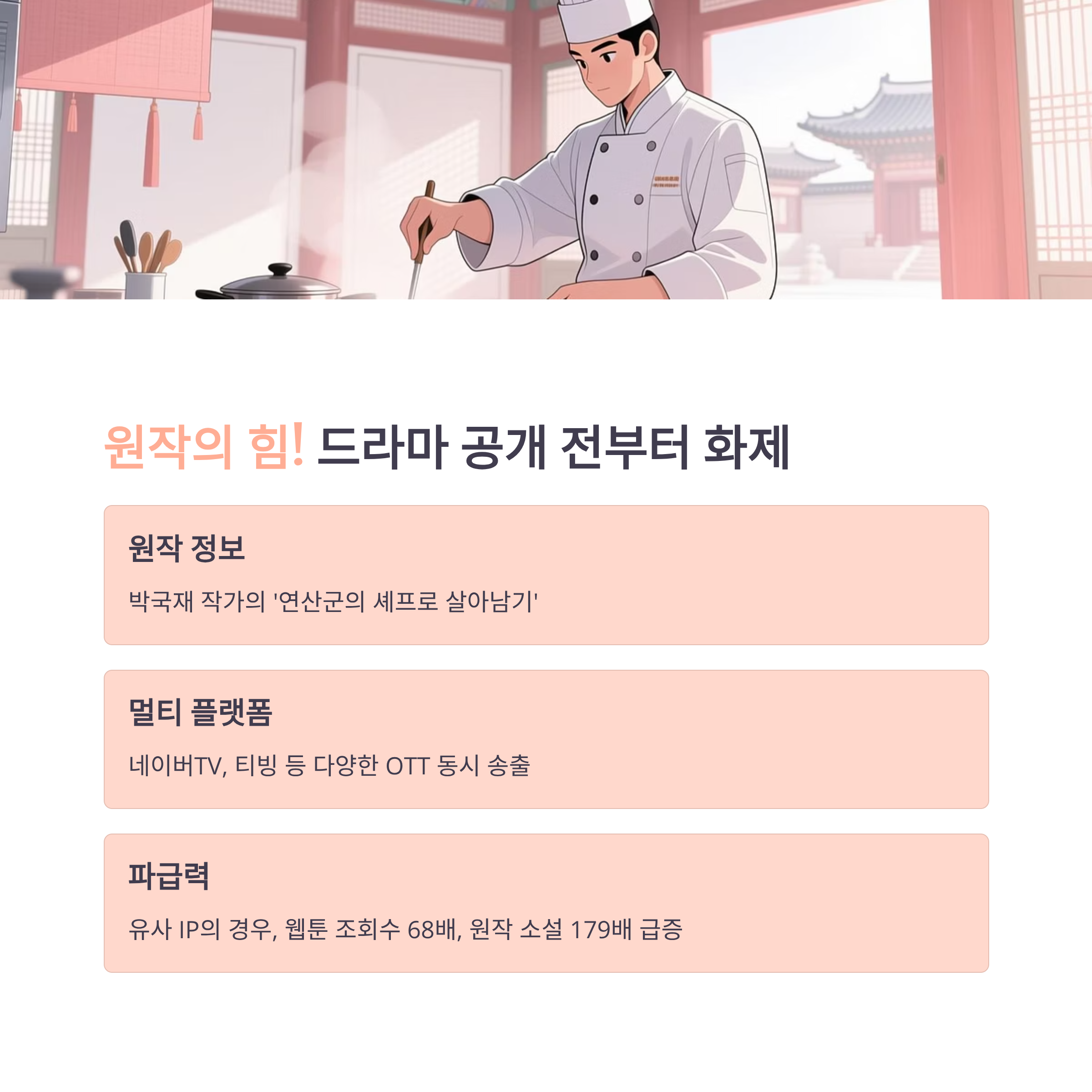 원작은 박국재 작가의 웹소설 「연산군의 셰프로 살아남기」로, 드라마화 이후 웹툰 및 원작 소설 조회수가 폭등하며 IP 파급력이 강하게 나타나고 있습니다.