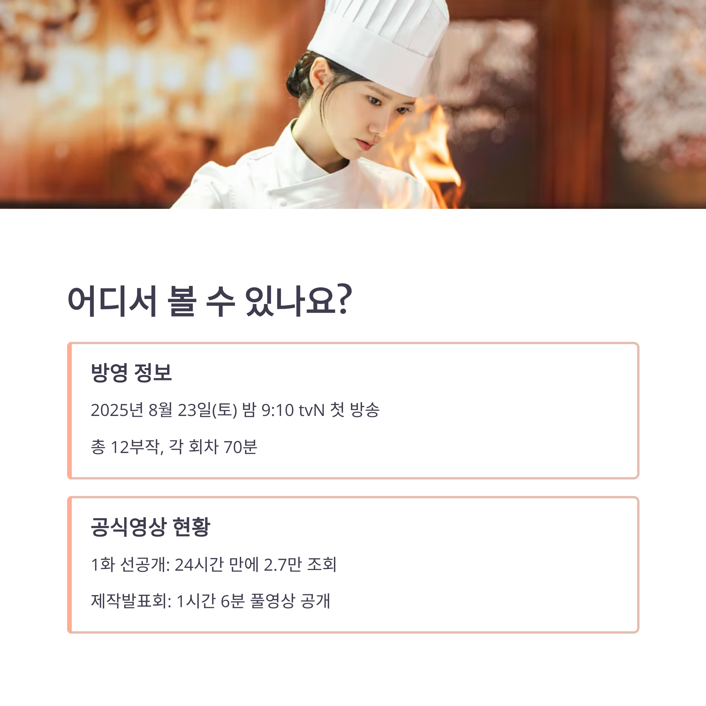 “타임슬립 판타지 + 궁중 생존 + 요리”라는 신선한 조합의 드라마가 시작되었습니다.