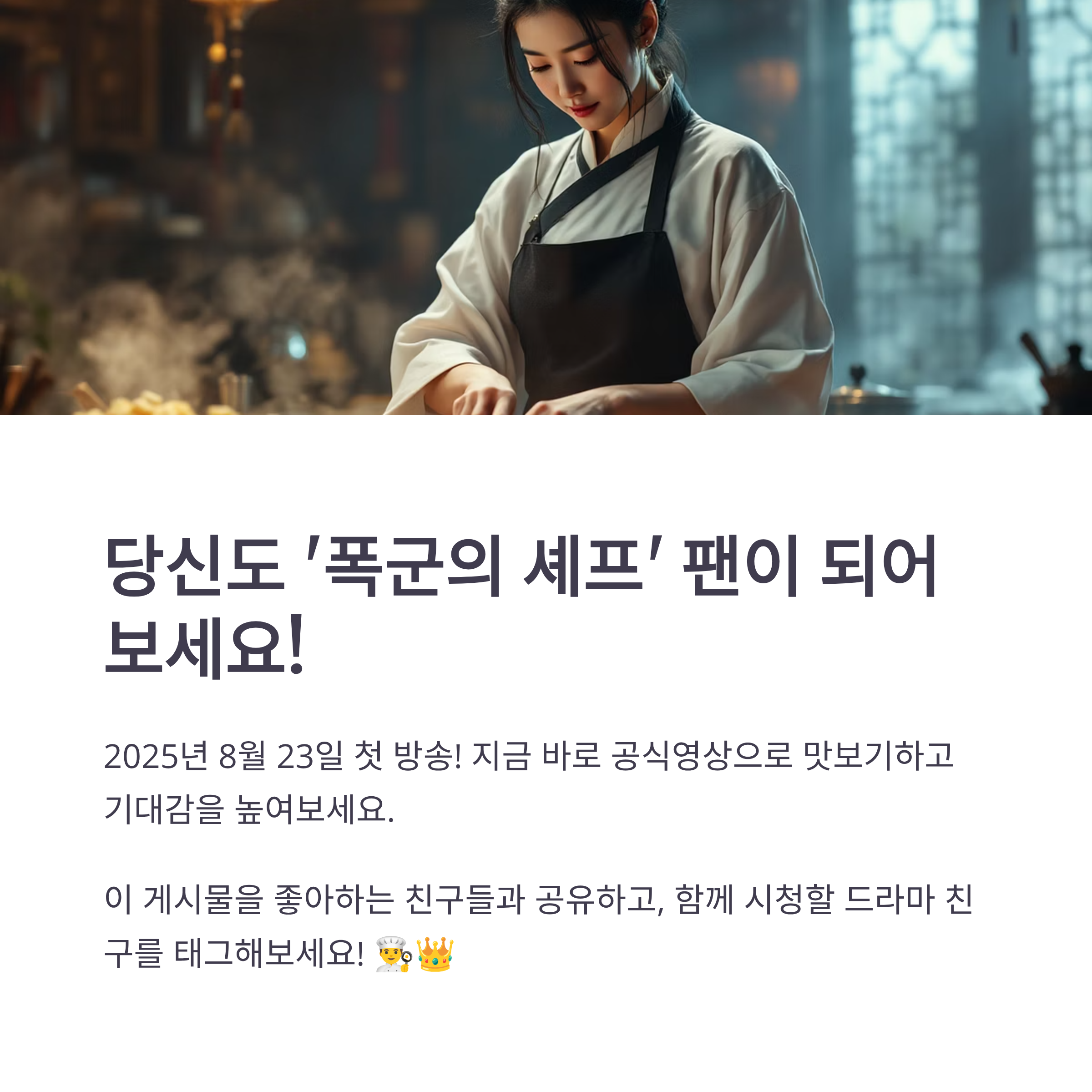 바로 tvN에서 2025년 8월 23일 첫 방송된 <폭군의 공식 셰프>인데요. 동명의 인기 웹소설을 원작으로 한 이 드라마는 공개와 동시에 폭발적인 반응을 얻으며 뜨거운 관심을 받고 있습니다.