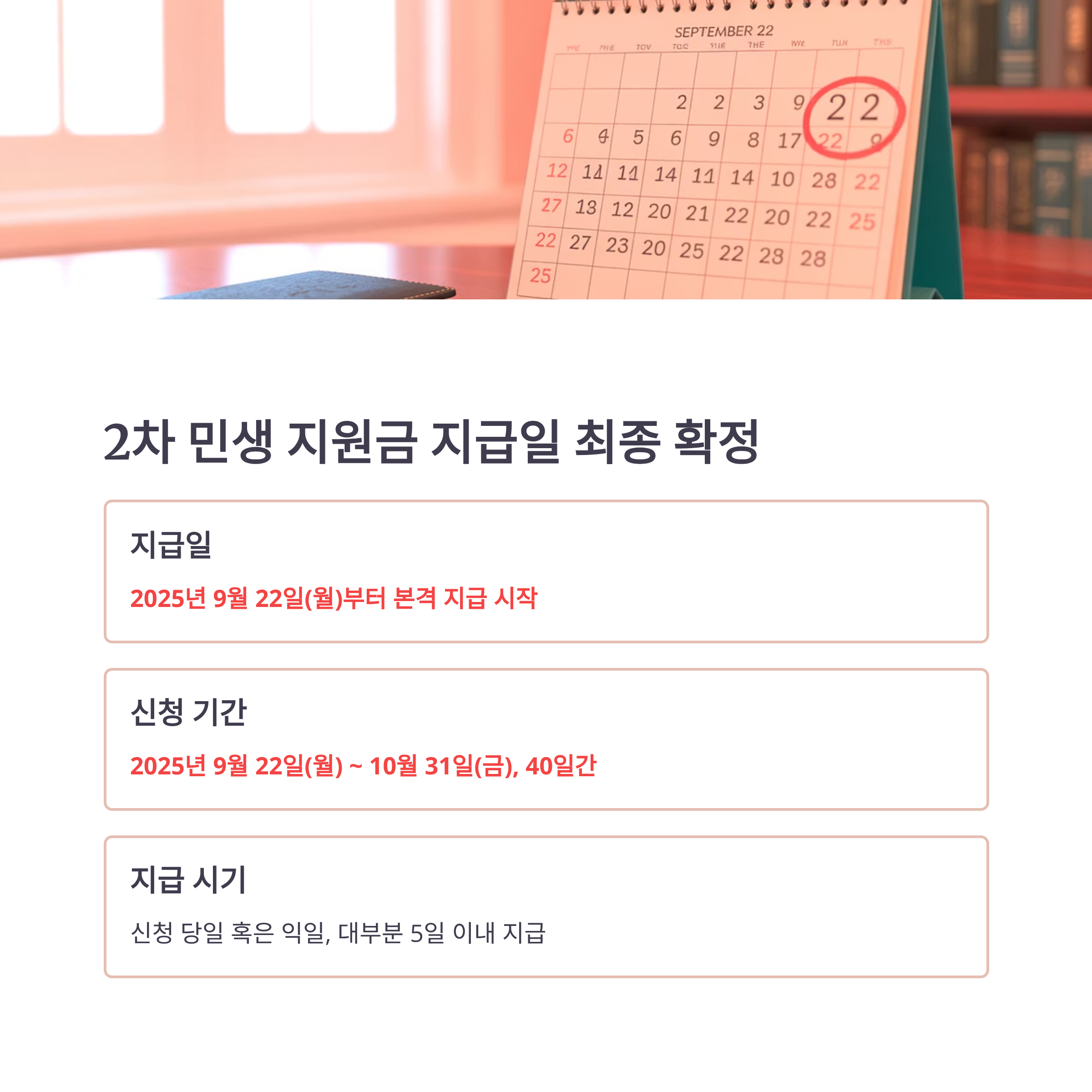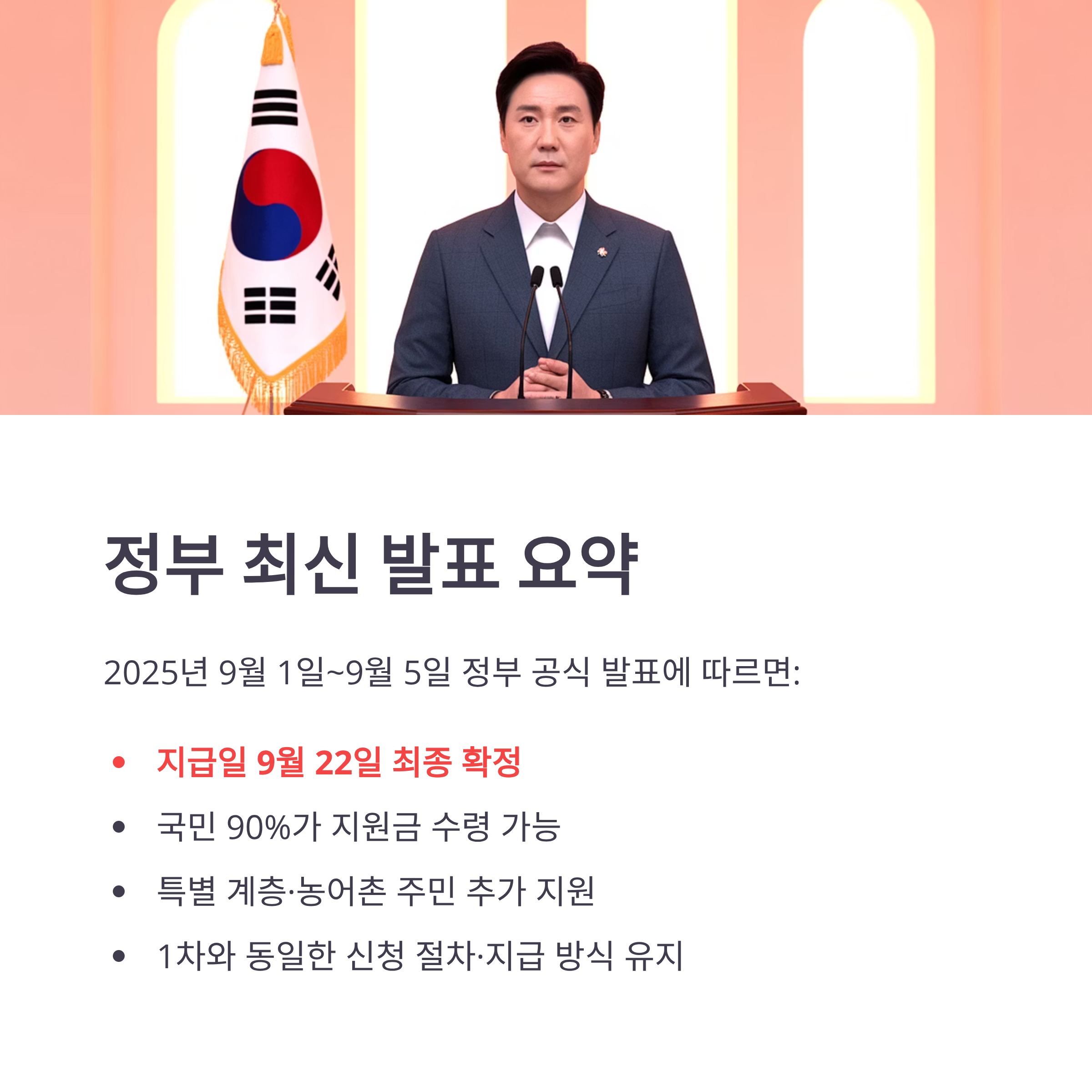2025년 9월 1~5일 정부 발표에 따르면, 제2차 민생지원금 지급일은 9월 22일로 최종 확정되었으며, 신청 절차와 지급 방식은 1차와 동일하게 유지됩니다.