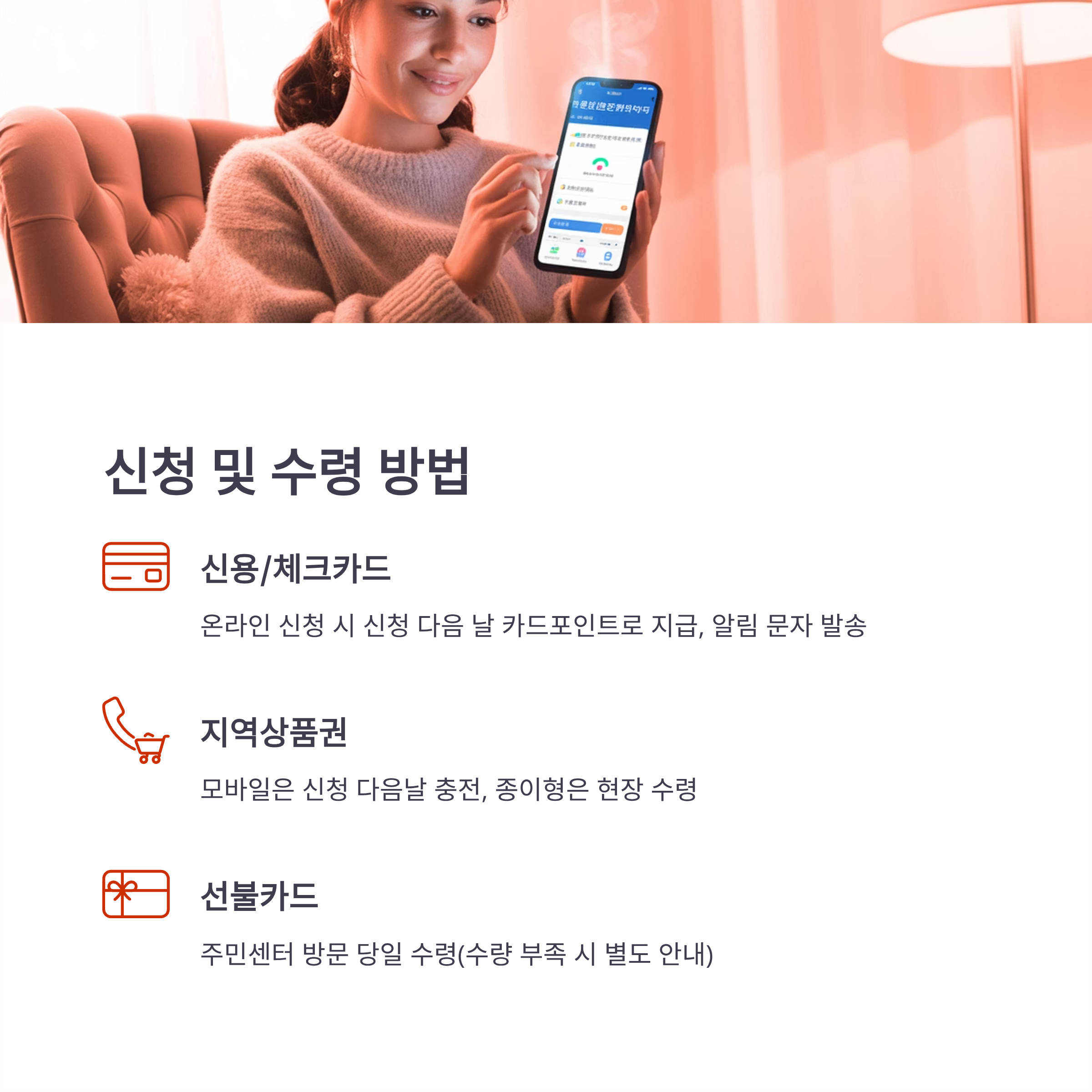 - 신청 경로: 주민센터 방문, 카드사(신용/체크카드사), 지역사랑상품권 앱